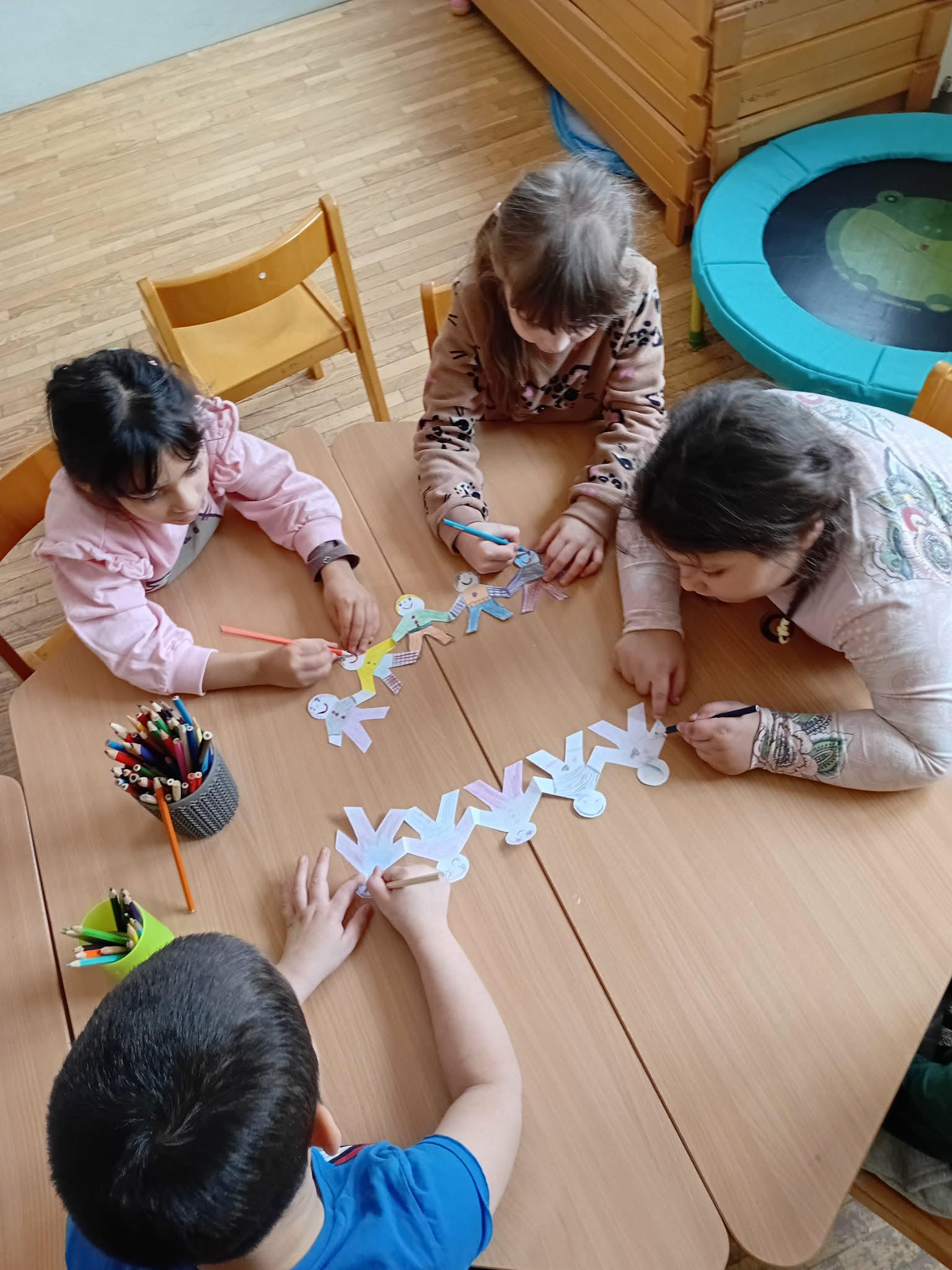 A foglalkozást az „Almát szedj, ügyesedj!” „A haragom kifújom, mint a cica nyújtózom”, „Domborítok, mint a cica, házba bújok, mint a csiga” relaxációs gyakorlattal indítottuk. A Bagdi Bella: „Ha boldog vagy…” dalával pozitív energiákat szabadítottunk fel, a gyermekek lelkesen, önfeledten táncoltak, mozogtak a zenére, majd a „Kis barátom, hogy vagy?” játékkal folytattuk a foglalkozást. Ezután készítettünk barátság karkötőt, amit az érzelmileg, hozzájuk legközelebb álló gyermeknek ajándékozhattak. A mezítlábas ösvényen egymást kellett vezetni, így lehetőség nyílt a baráti kapcsolatok, a bizalom alakítására, erősítésére. A foglalkozások alkalmával játszottunk „Szomorú Szilárd, és Boldog Blanka” szituációs játékot is, amit a gyermekek nagyon élveztek. Készítettünk „Bartság-ujjlenyomatok” táblát is, amelyre a gyermekek egymás ujjlenyomataiból különböző ábrákat készítettek. A csoportunk összetételét illetően, a gyermekek sajátos nevelési igényű, tanulásban akadályozott gyermekek, ezért a feladatok elvégzésében, az érzelmek kifejezésében, megfogalmazásában sok segítséget igényeltek, igényelnek.