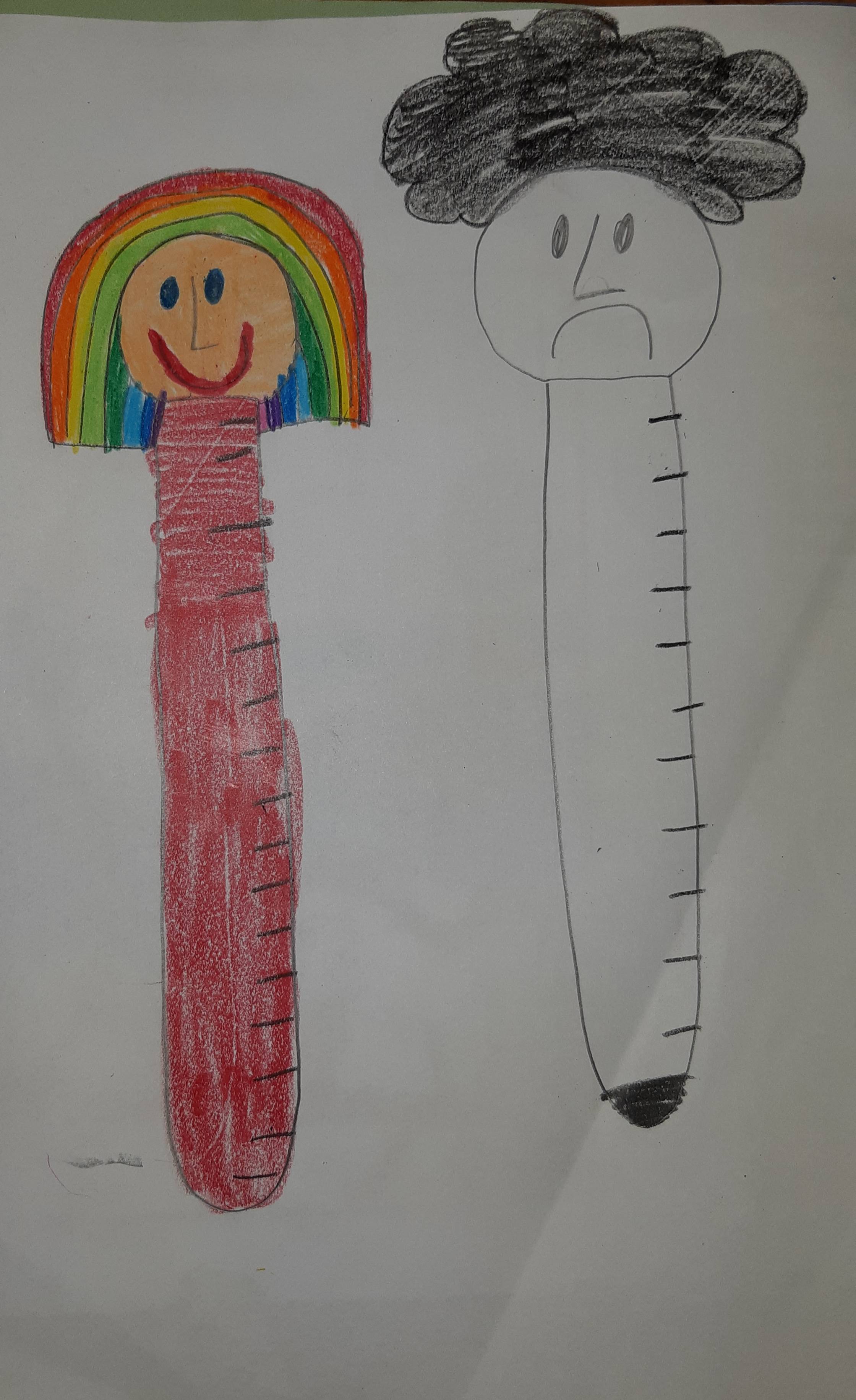 Az egyik kislány egy vulkánban jelenítette meg a kicsi lelkét, amely most már nem tör ki a megtanult technikáknak köszönhetően, mint kezdetben. A többiek hasonlót rajzoltak: egy pozitív és egy negatív formába megjelenített hőmérőt.
