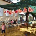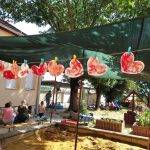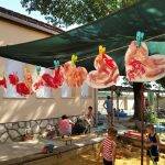 A havi témát az összevont nyári oviban dolgoztam fel a gyerekekkel. A diófa nyújtotta árnyékban történt a beszélgetés és a szívek elkészítése. A kiállítást az elkészült munkákból az árnyékolók póznájához kihúzott zsinegre tettük színes csipeszek felhasználásával. Így délután, amikor a gyerekekért jöttek a szülők, ők is részesei lehettek az ügyes kis kezek nyújtotta látványnak.