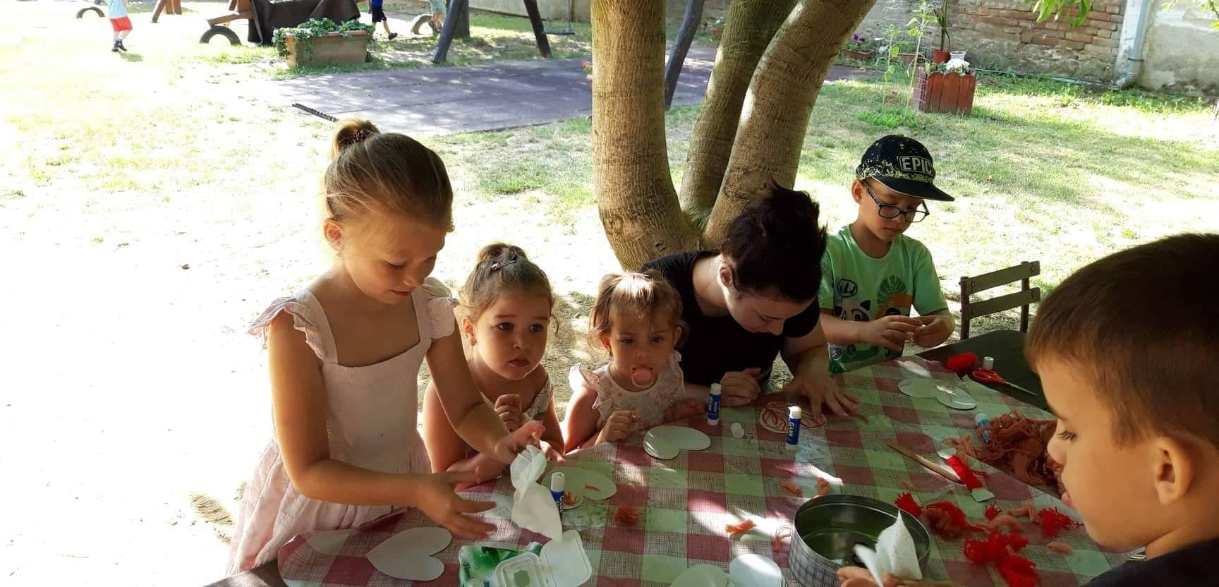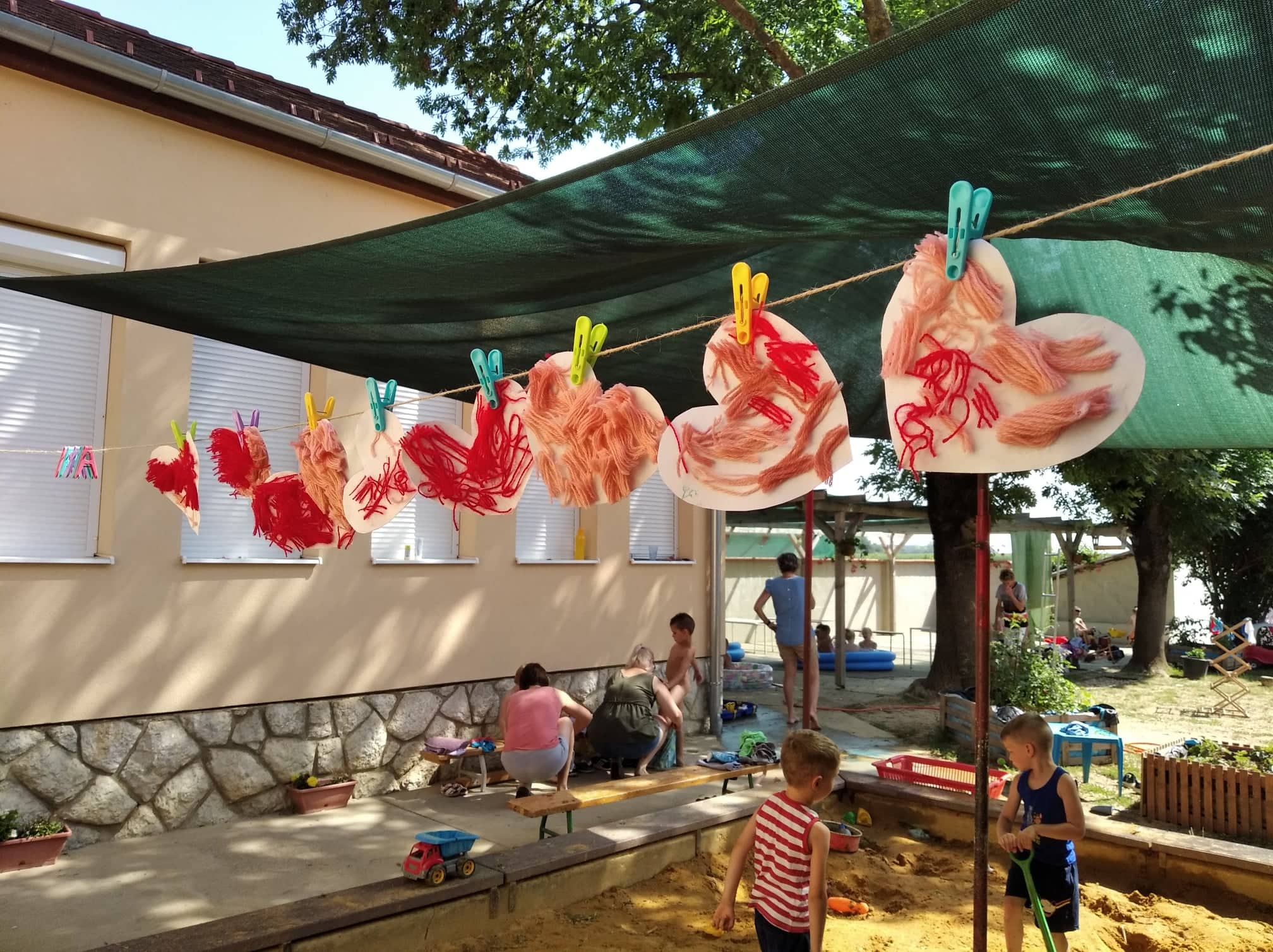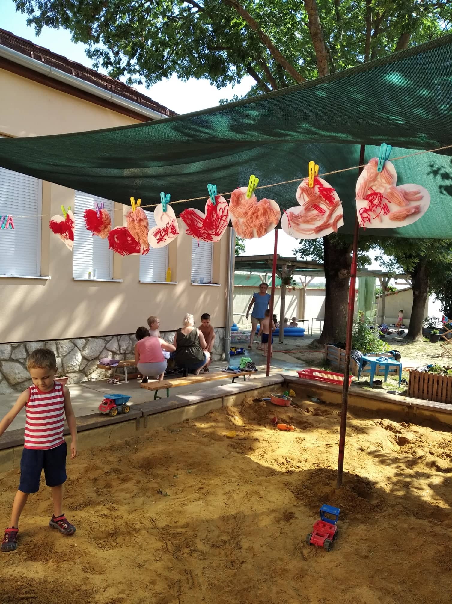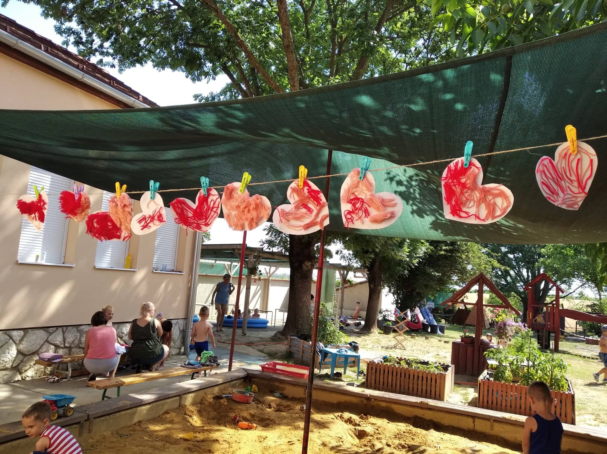 A havi témát az összevont nyári oviban dolgoztam fel a gyerekekkel. A diófa nyújtotta árnyékban történt a beszélgetés és a szívek elkészítése. A kiállítást az elkészült munkákból az árnyékolók póznájához kihúzott zsinegre tettük színes csipeszek felhasználásával. Így délután, amikor a gyerekekért jöttek a szülők, ők is részesei lehettek az ügyes kis kezek nyújtotta látványnak.