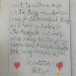Láttam egy interjút egy 107 éves néniről, aki imád élni, a mai napig sétál, olvas, sőt még számítógépezik is. Ezt a kisvideót levetítettem a gyerekeimnek, megbeszéltük, mi lehet a titka, mi mindent tanulhatnak ettől a bölcs, életvidám öreg nénitől.Ezután azt a feladatot kapták, hogy írjanak egy levelet Gizi néninek, hogy miért hálásak neki, mit tanultak tőle. Többek között azt, hogy az élet változásaihoz alkalmazkodni kell… Ezeket a leveleket összegyűjtöttem és elküldtem ennek a néninek…