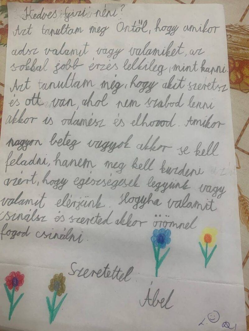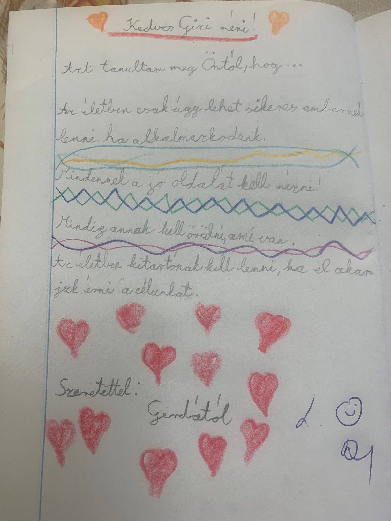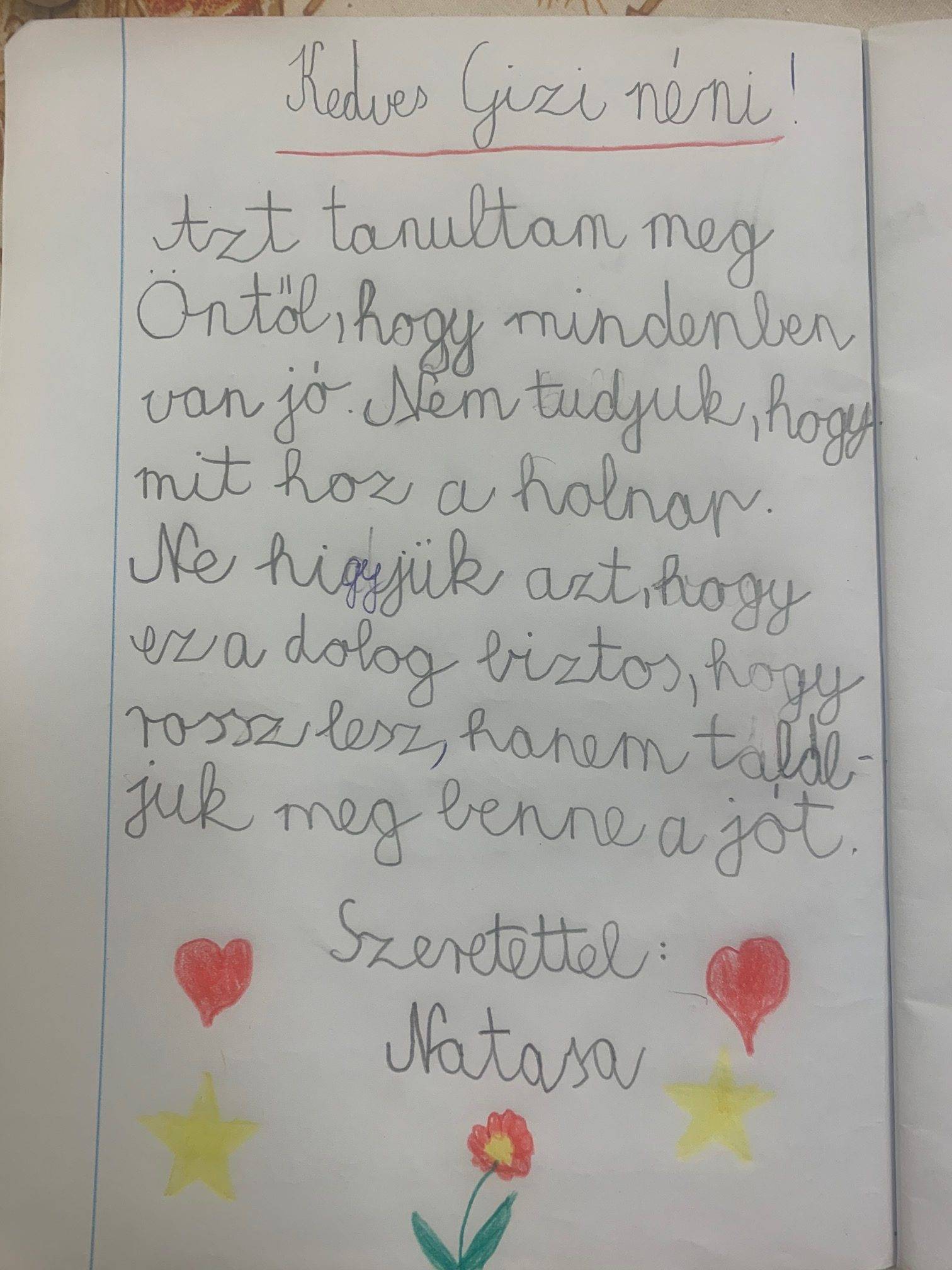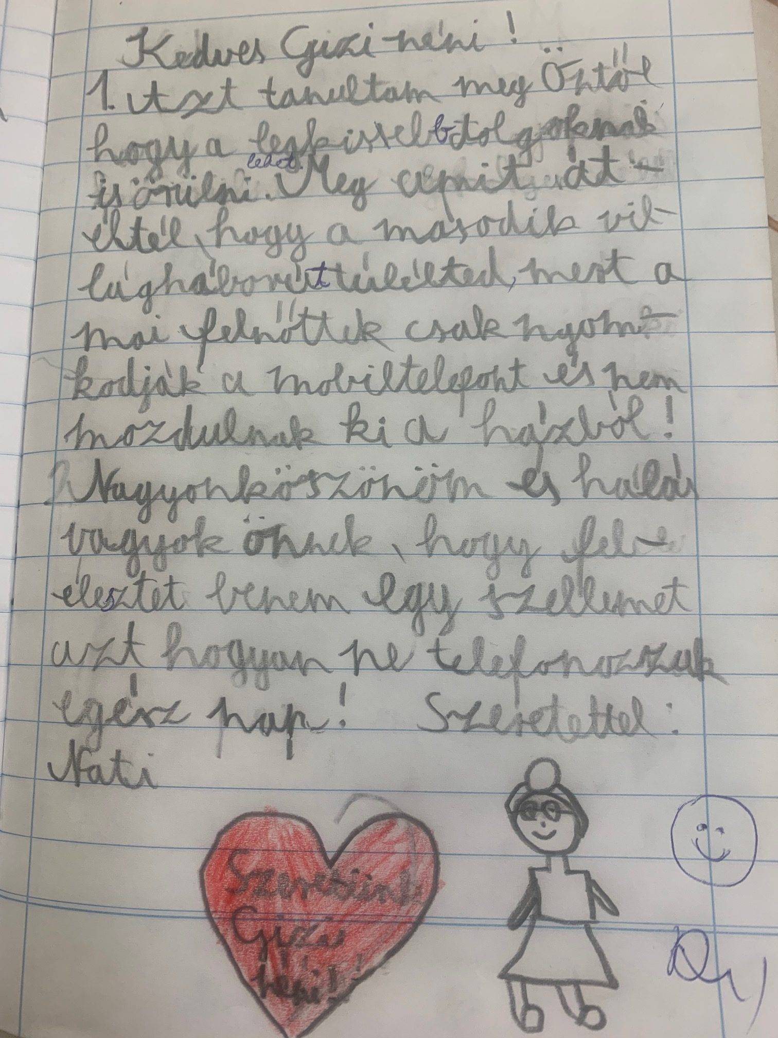 Láttam egy interjút egy 107 éves néniről, aki imád élni, a mai napig sétál, olvas, sőt még számítógépezik is. Ezt a kisvideót levetítettem a gyerekeimnek, megbeszéltük, mi lehet a titka, mi mindent tanulhatnak ettől a bölcs, életvidám öreg nénitől.Ezután azt a feladatot kapták, hogy írjanak egy levelet Gizi néninek, hogy miért hálásak neki, mit tanultak tőle. Többek között azt, hogy az élet változásaihoz alkalmazkodni kell… Ezeket a leveleket összegyűjtöttem és elküldtem ennek a néninek…