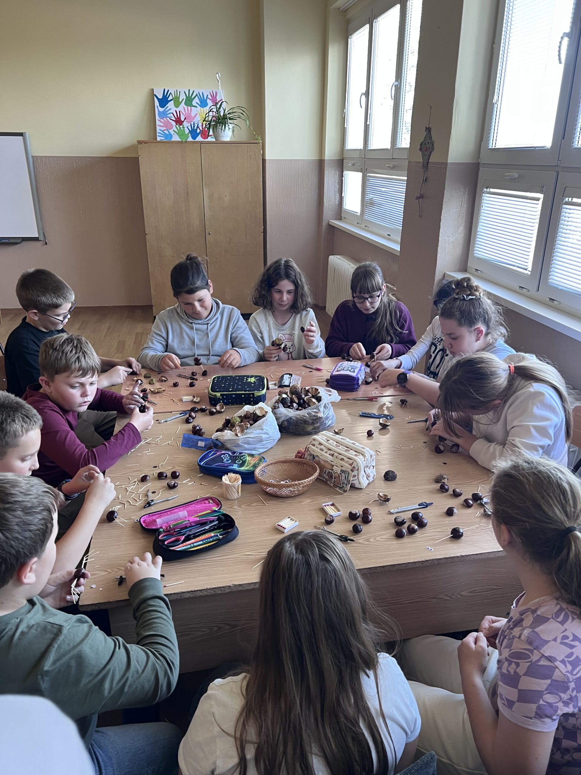 A tanév első foglalkozása a hála témáját dolgozta fel. Az ötödikesek „hálakezeket” készítettek – mindegyik ujjra rákerült valami, amiért köszönetet éreznek. A közös munkát gesztenyék koronázták meg: elkészült az osztály „gesztenyecsapata”, a barátság és összetartozás jelképeként. Minden apró figura egy-egy gyerek jókedvét hordozza magában – így vált a foglalkozás igazi, szívet melengető közösségi élménnyé.