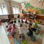 Akadálypályákat készítettünk a csoportszobában, ahol a kalandok során átkelhettünk patakokon, sétálhattunk hidakon, hegyet mászhattunk, belepottyanhattunk a tengerbe. Erdőbe is bementünk, ahol a „Medvevadászat” játékot eljátszva megijedhettünk a Medvétől, de végül biztonságban hazaértünk.