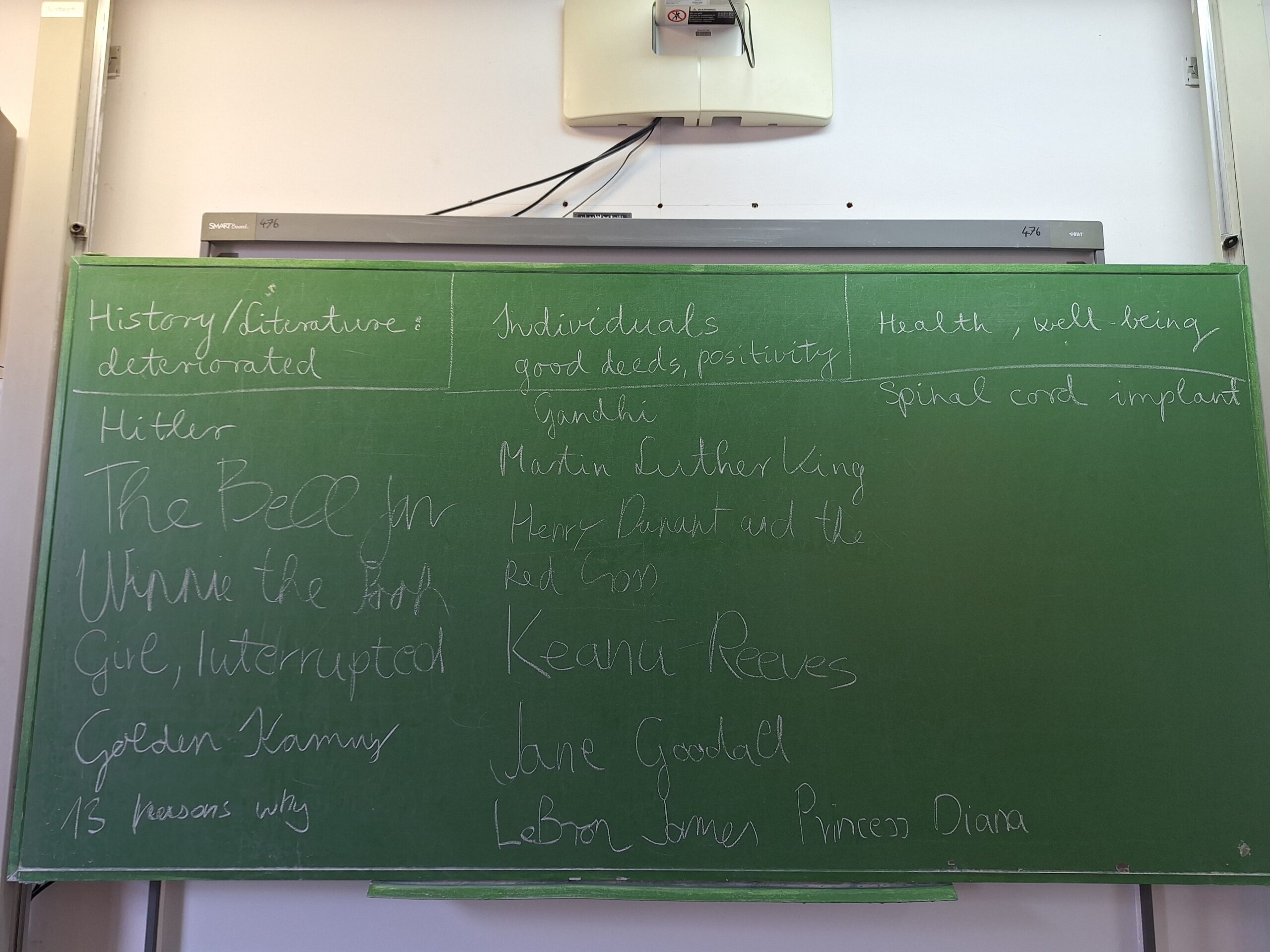 Az English B órákon pedig minden diák prezentációt készített egy általa választott témáról. 3 lehetőség közül választhattak: 1. Irodalmi, történelmi személy, akinek a rossz mentális állapota végzetes következményekkel jár. 2. Egy személy, aki jótetteiről híres. 3. Egy tetszőleges egészséggel kapcsolatos téma.