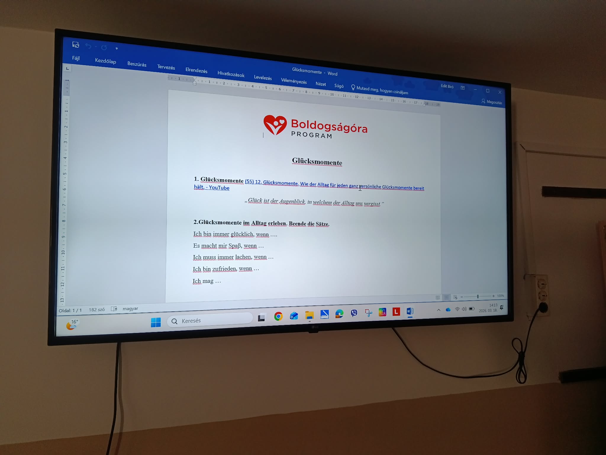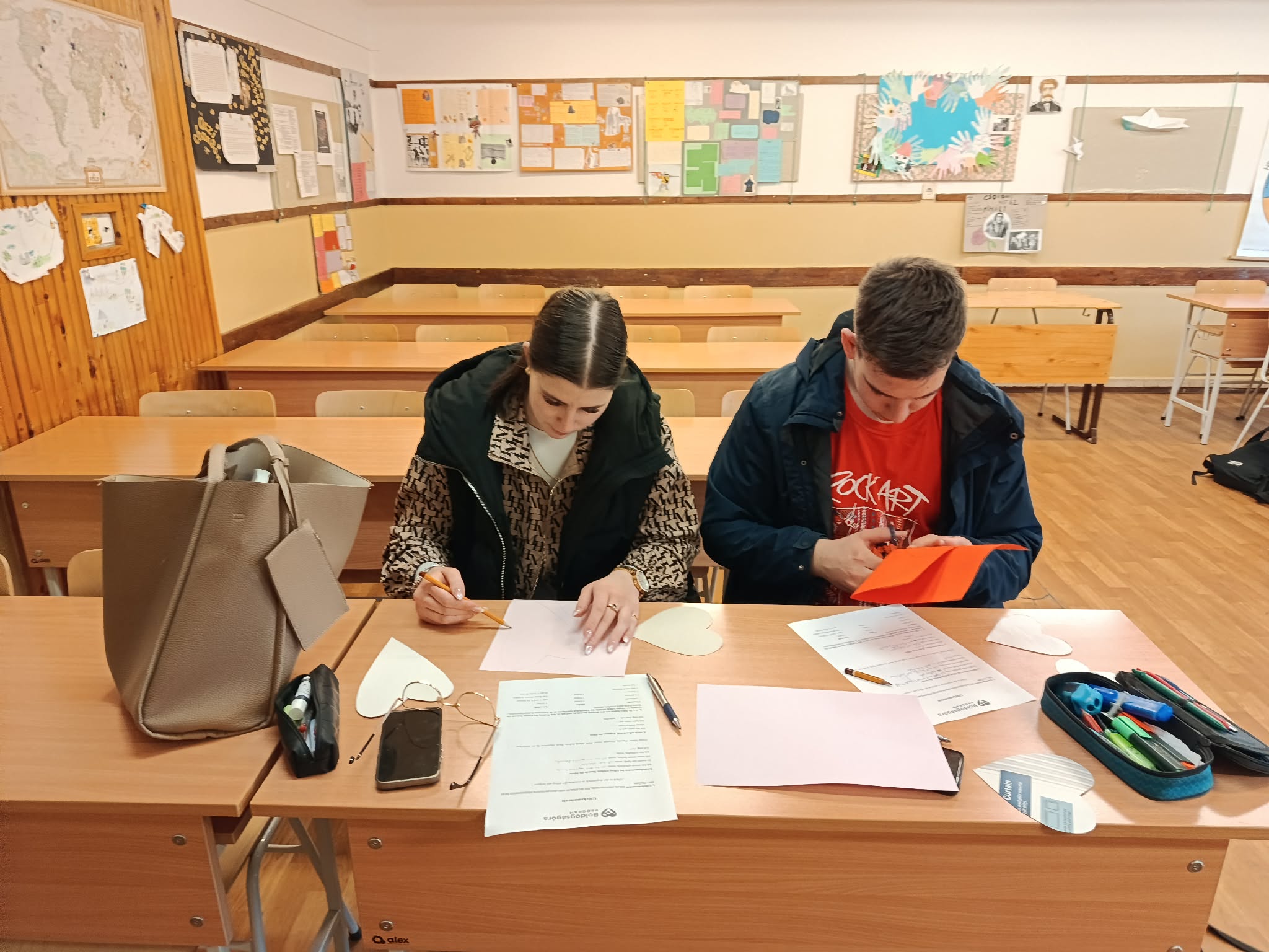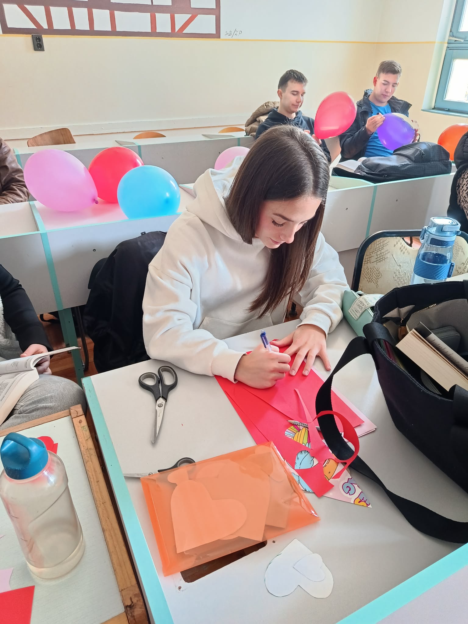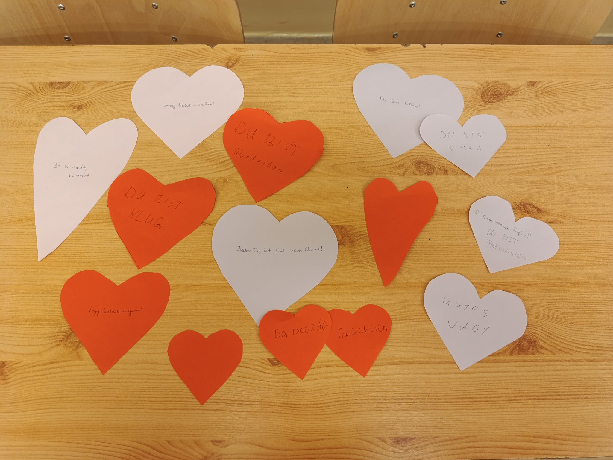 Mivel a következő nap ünnepeltük iskolánkban a Boldogság Világnapját, színes papírokból szíveket vágtunk ki, amelyekre motiváló üzeneteket írtunk magyar és német nyelven, majd ezeket a diákok átadhatták társaiknak, barátaiknak, ismerőseiknek.