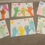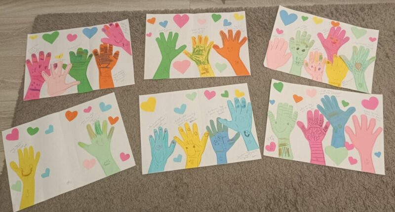 Kedves gondolatokat fogalmaztak meg a gyerekek, és saját kezük körberajzolásával és a kéz díszítésével miután mindenki elkészült, a kezeket kivágtuk, és egy nagy közös lapra felragasztottuk. Így integettünk kis hiányzó beteg társunknak, és üzenetek megfogalmazásával és szívecskék felragasztásával elkészítettük a kedves ajándékot. Mindenki megfogalmazta a saját kis gondolatát, amiket felírtam a lapokra.