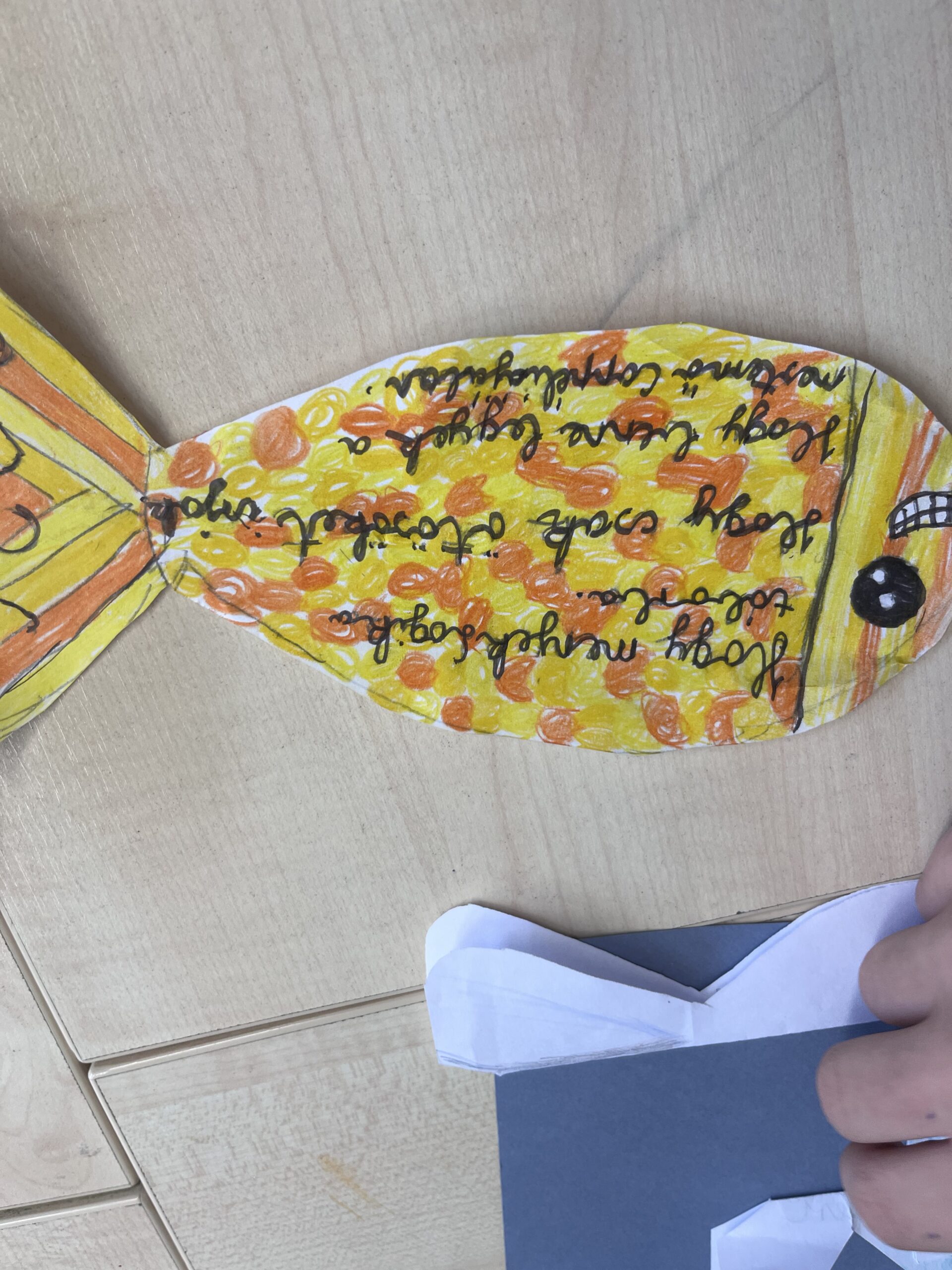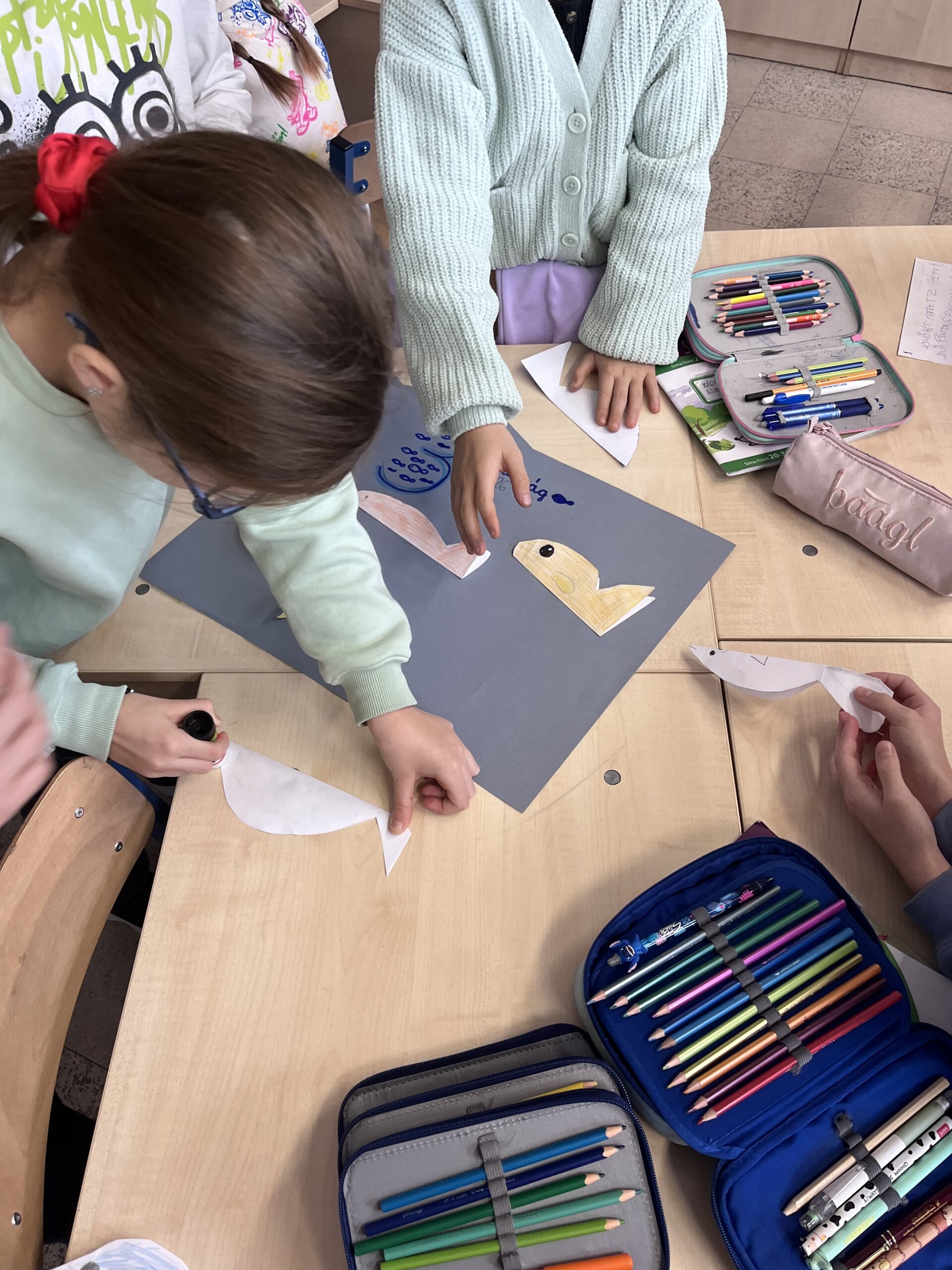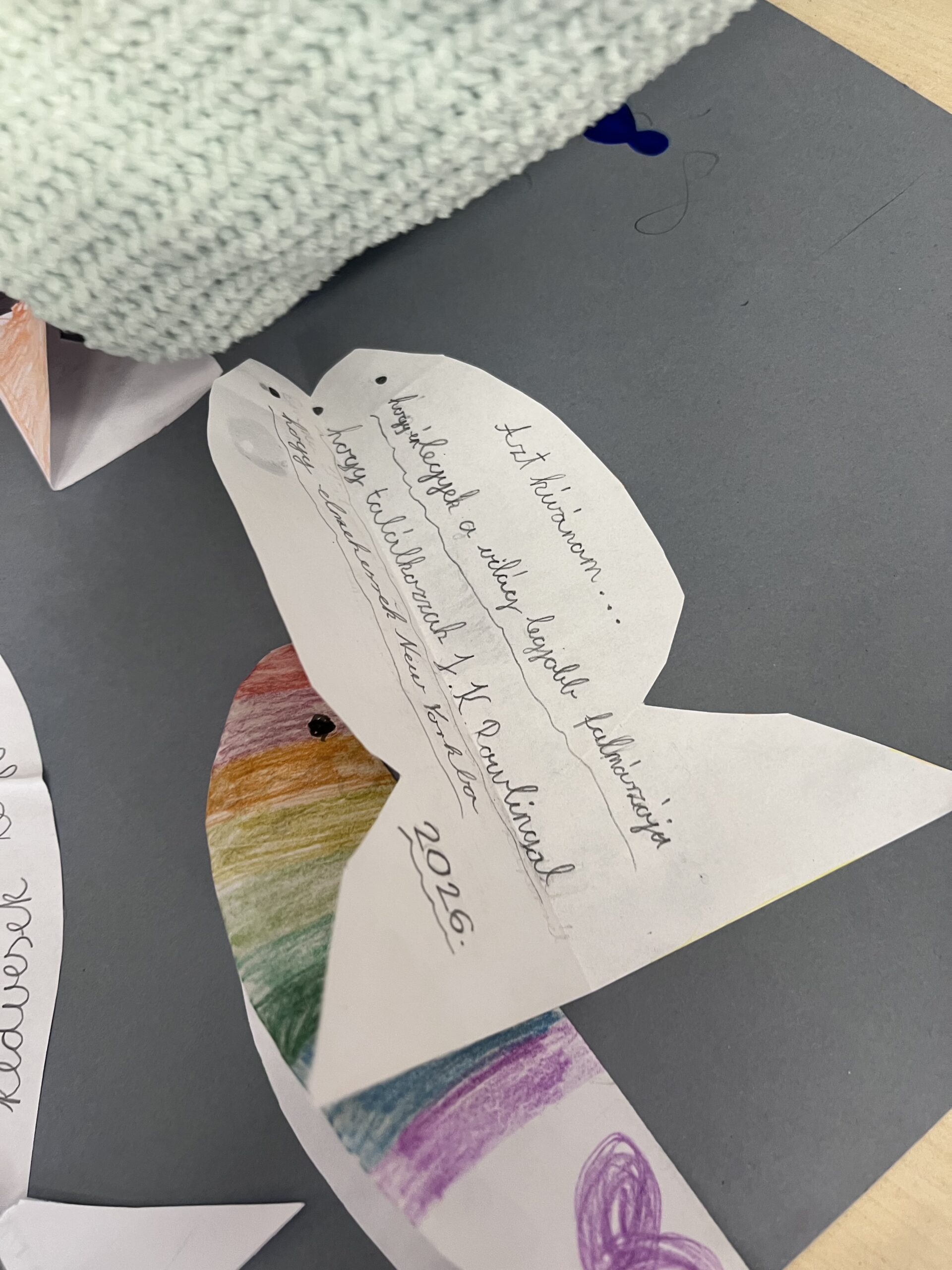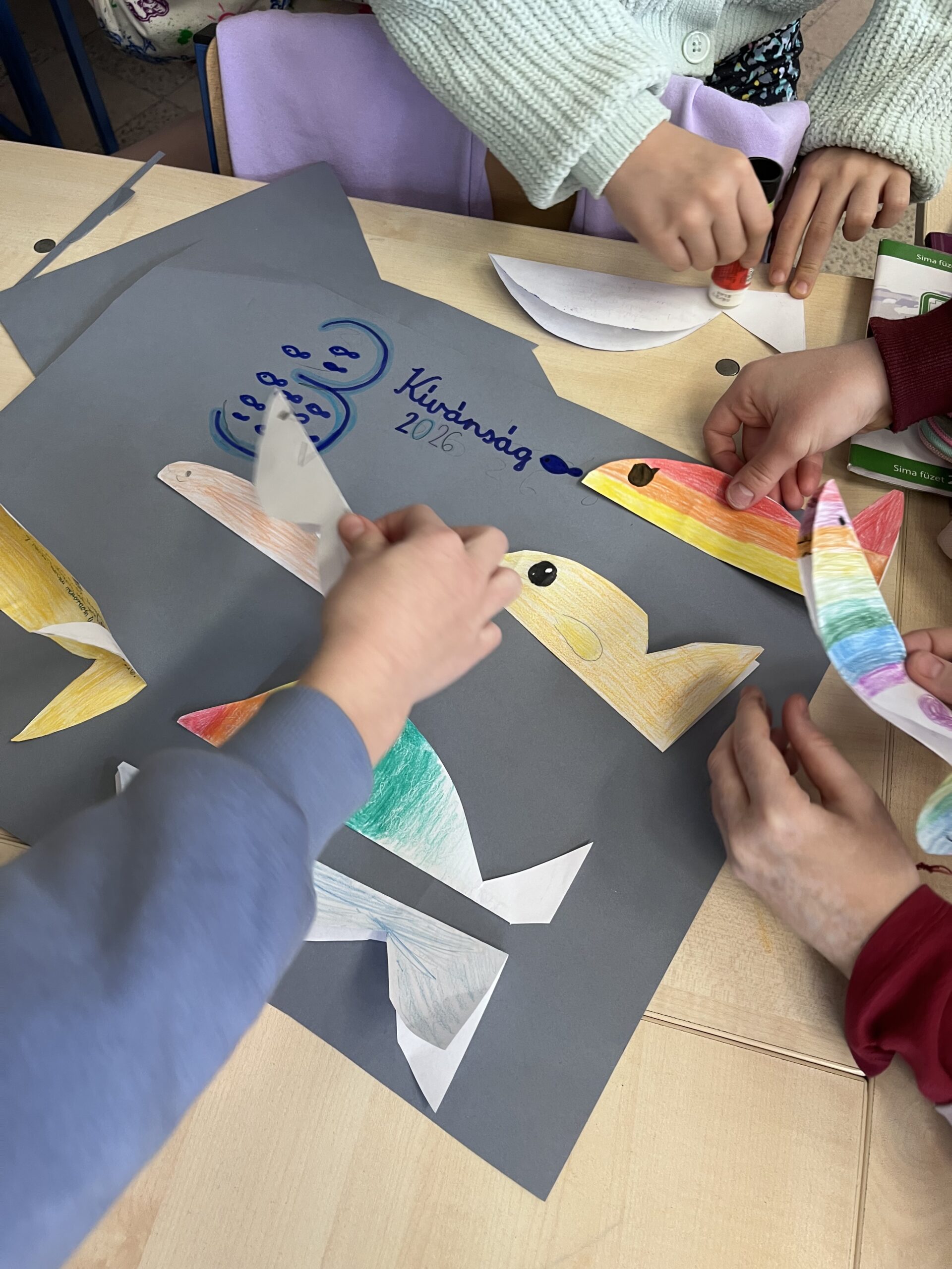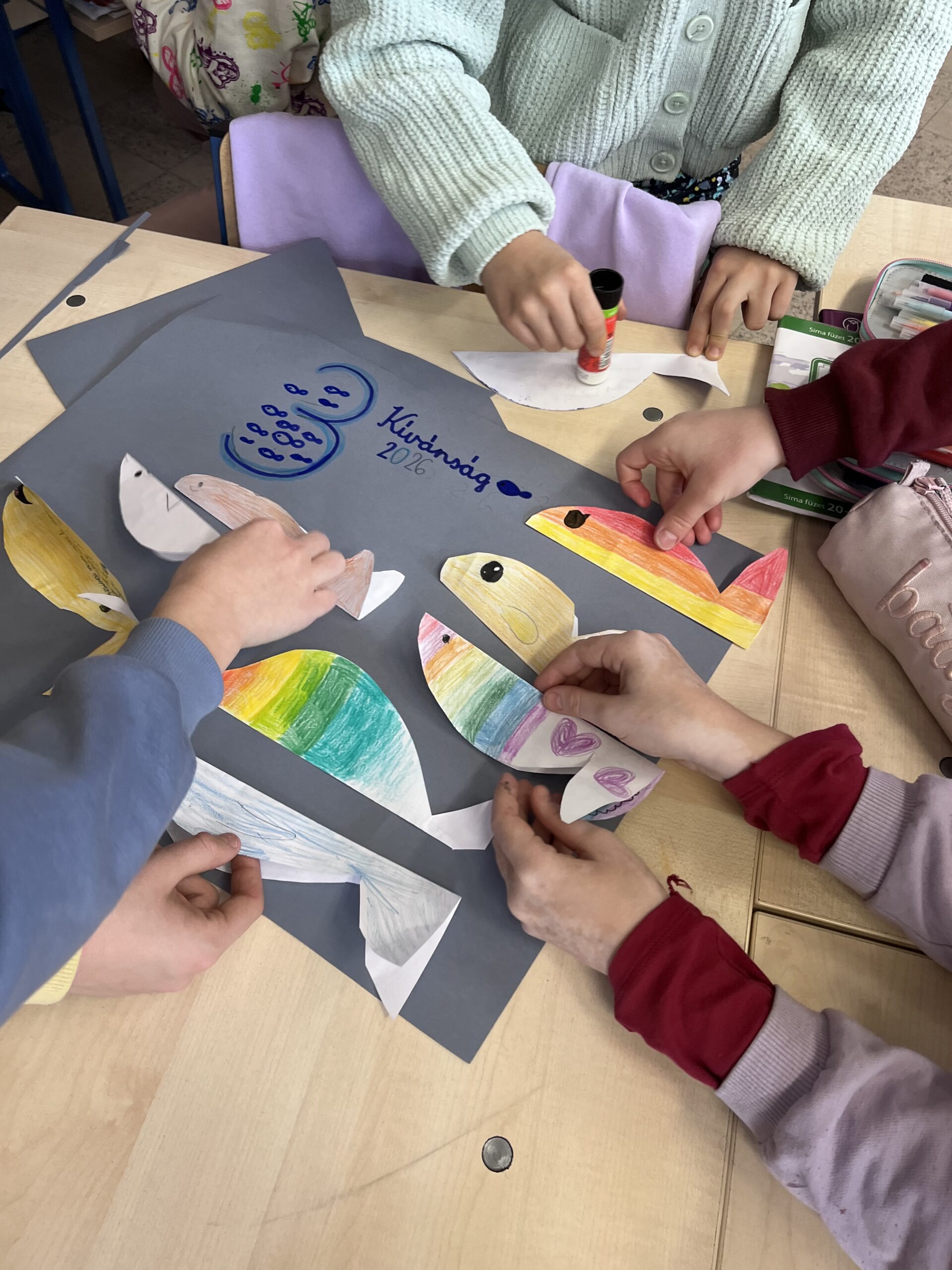 A „Ha lenne három jókívánságom” feladat során három kívánságukat egy-egy kivágott halacskára írták vagy rajzolták fel a gyerekek, majd ezeket egy közösen készített jókívánság-plakátra ragasztottuk. A közös alkotás erősítette az összetartozás élményét, és lehetőséget adott annak felismerésére, hogy sok kívánság nemcsak egyéni, hanem közösségi jelentéssel is bír.