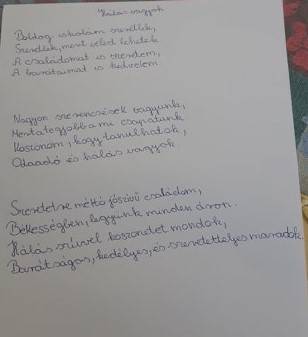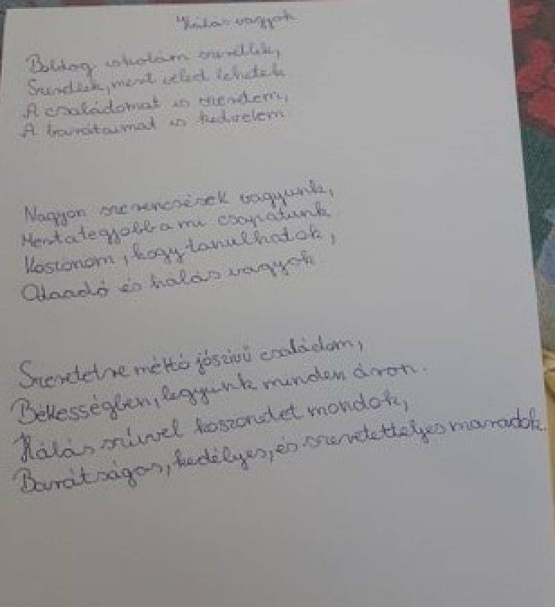 Választható feladat közül a versírás tetszett számunkra a legjobban. Összegyűjtöttük a gyerekekkel, hogy milyen szavak jutnak eszükbe a háláról, majd közösen versbe öntötték. Lélekfelemelő érzés volt megélni azt, hogy az ötödikes gyerekek milyen nagy érzelemmel, milyen nagy szókinccsel rendelkeznek ahhoz,hogy ilyen mondatokat tudjanak rímbe szedni az egyik legszebb emberi érzésről.