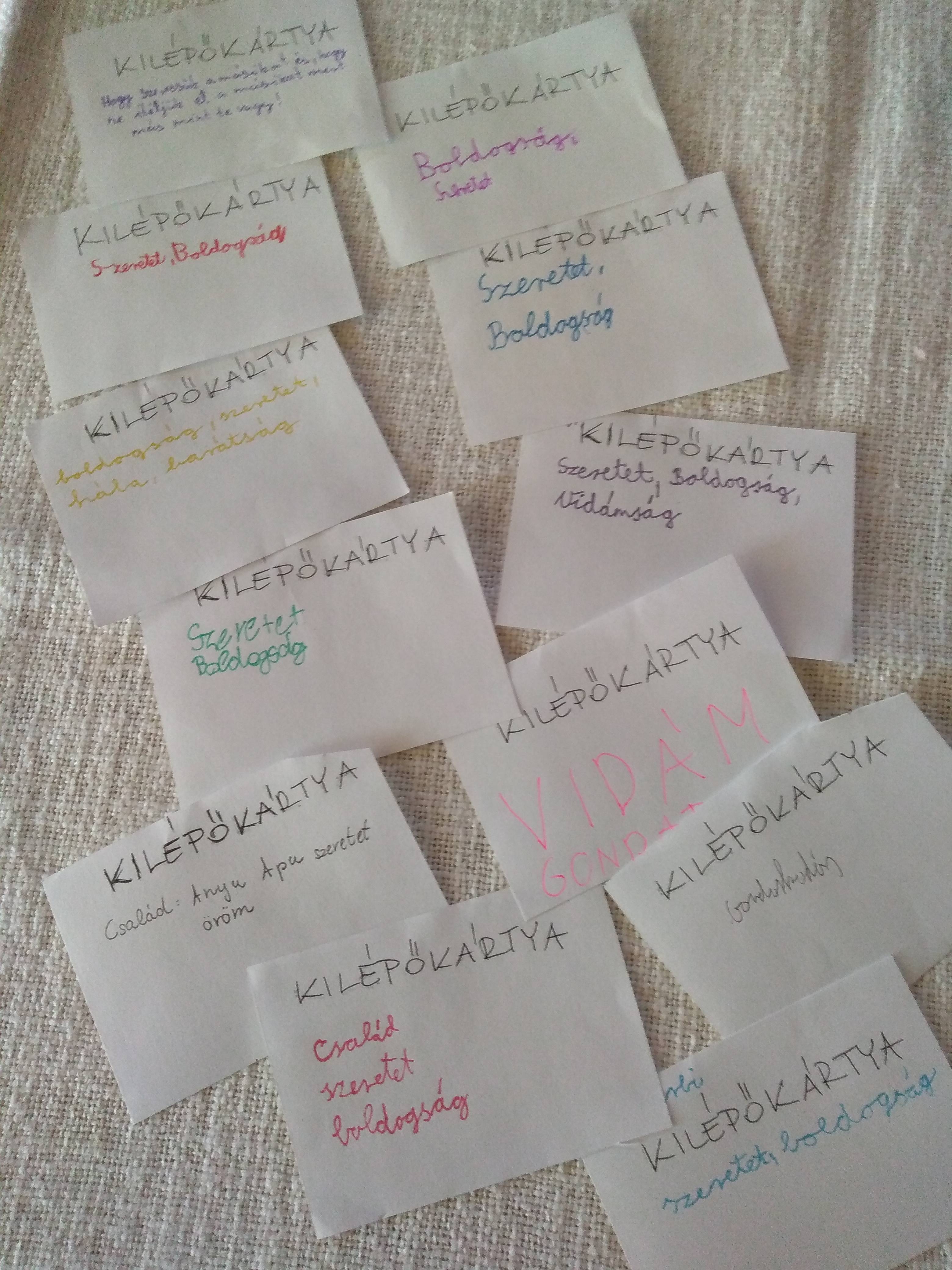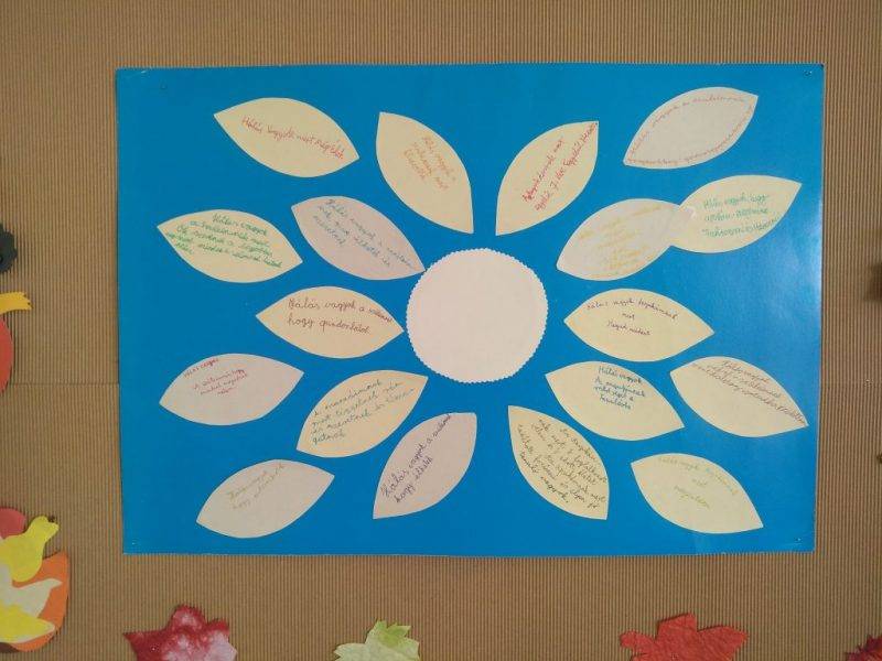 Szeptember közepén megbeszéltük a gyerekekkel, hogy a következő osztályfőnöki órán a boldogságóra egyik témájáról a boldogságfokozó háláról beszélgetünk. Az ajánlott óraterv alapján haladtunk. Megbeszéltük kinek mit jelent az öröm, a boldogság illetve a hála fogalma. Kinek mivel okozhatunk örömet, hogyan tudjuk a hálánkat kifejezni, kiknek és miért tartozhatunk hálával, köszönettel. Ez után elkészítettük a mi hálanapunkat, majd az óra befejezéseként minden tanulónak adtam egy kilépőkártyát, amire felírták a gyerekek az beszélgetés utáni érzéseiket. Örömmel tapasztaltam, hogy mindenki pozitív érzelmekkel távozott az óráról.