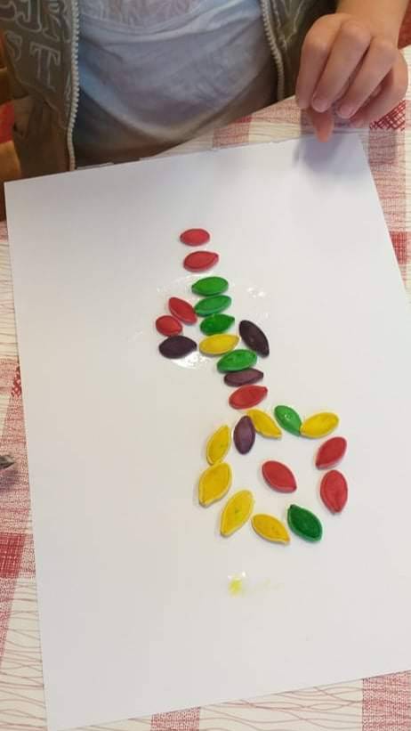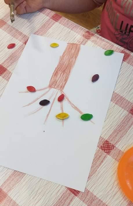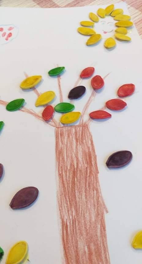 A hala fát hála virágot készitettek a gyermekek festett tökmagból.Minden gyermek hálás volt azért hogy újra együtt van a csoport , együtt jatszhatnak , és egészségesek.