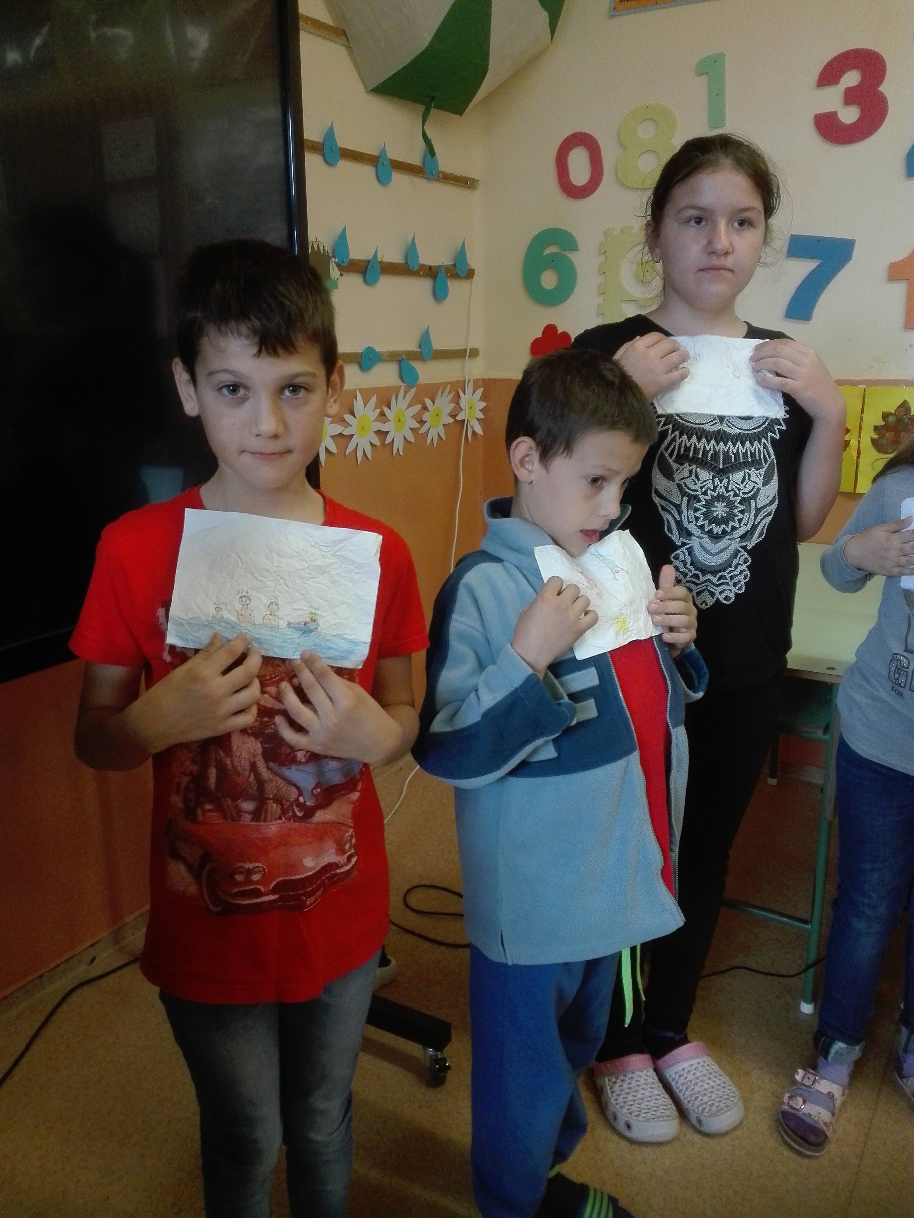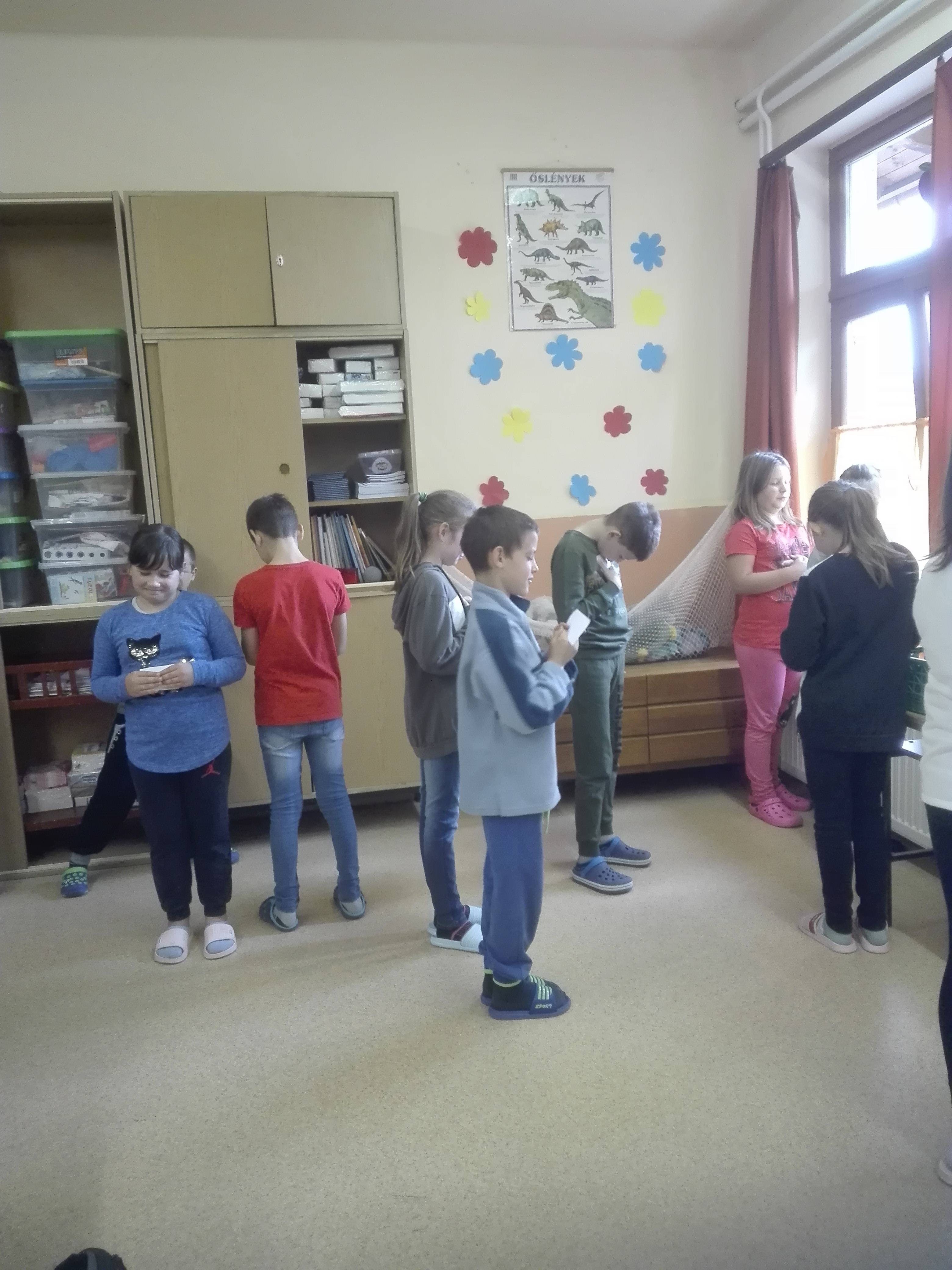 A hónap dalának meghallgatása után megkértem a gyerekeket, hogy készítsenek egy rajzot egy nyári emlékükről, amiért hálásak lehetnek. A rajzok elkészülte után a rajzokat gombocba gyűrve egy kupacba raktuk, majd mint egy tábortüzet körbe ültük. Mindenki kivett egy-egy gombócot. Izgatottak voltak, hogy valakinek egy szép emléke van a kezükben, majd egyenként bontottuk ki a rajzokat. Aki a rajzot kibontotta, beszélt arról, vajon miért volt hálás az a gyerek akinek a rajza a kezében volt. Ezután mindenki mondot egy-egy szót arról, hogy mi jut eszébe a hála szóról. Majd mindenki lerajzolta azt, ami a háláról eszébe jutott. Ezeket is egyesével mutattuk meg egymásnak. Zárókörként ,,jobbra,, ,,balra,, kártyák alkalmazásával csukott szemmel mozogtak az utasításoknak megfelelően. A játék végén akik legközelebb voltak egymáshoz, azok a gyerekek elmondták hogy miért hálásak egymásnak.