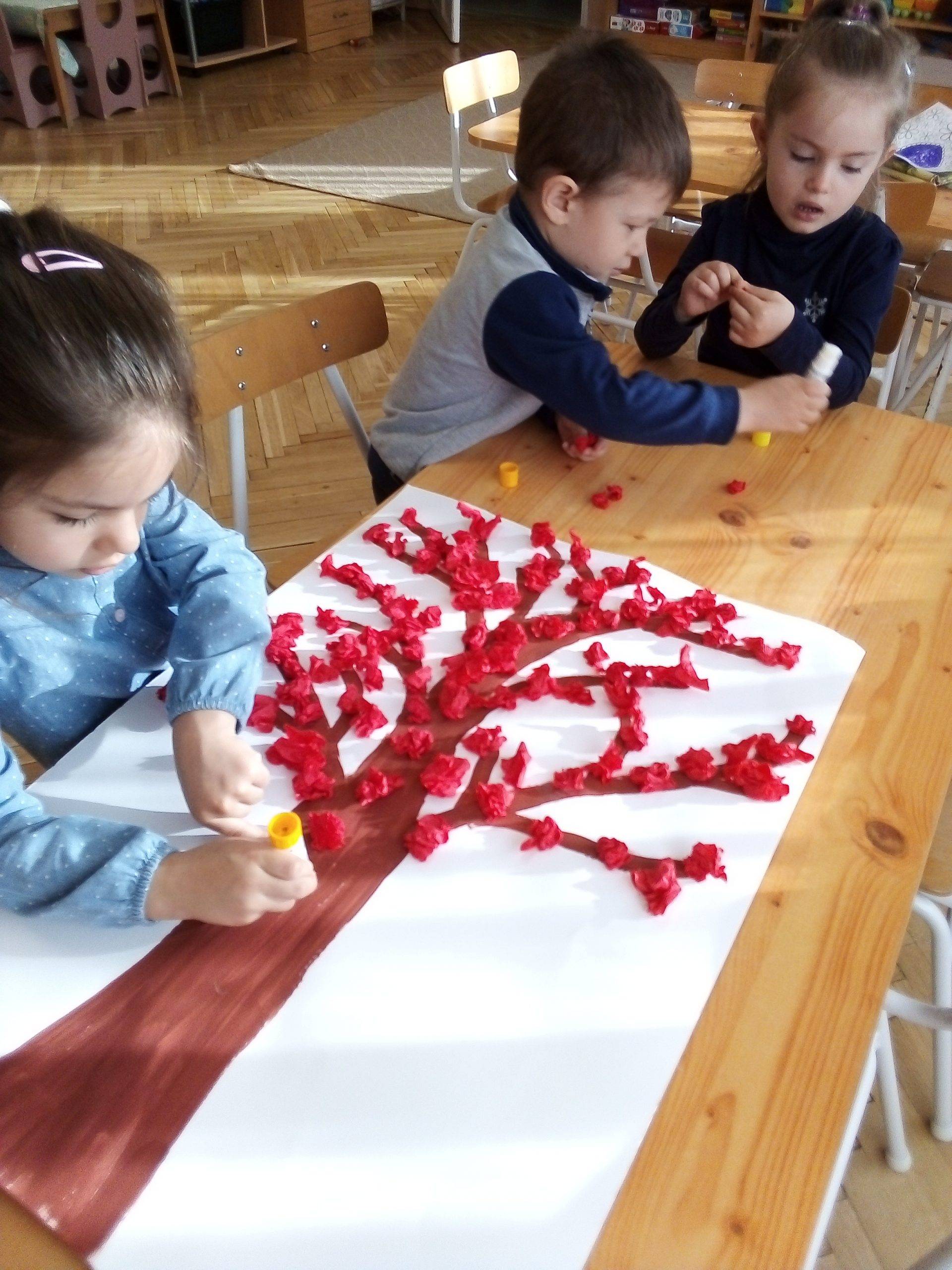 Ebben a hónapban a Boldogságóra témája a hála volt.A délelőtti „kis szőnyegre ülés”alkalmával beszélgettünk arról,hogy mit is jelent a hála,a köszönetmondás.Kiknek lehetünk hálásak pl.:szülők,nagyszülők,kis barátok….és miért lehetünk hálásak.Igyekeztünk életkoruknak megfelelően érzékeltetni és tudatosítani ezt a fogalmat.Arra törekedtünk,hogy az emberi kapcsolataikban próbálják megfogalmazni a hála és köszönet érzését.A beszélgetés végén Bagdi Bella:Ha boldog vagy…című dalát mozgással kísértük,ami a gyerekeknek nagyon tetszett.Majd az asztalnál elkészítettük a hálafánkat,ami utána az öltözőben a faliújságunkat díszítette.