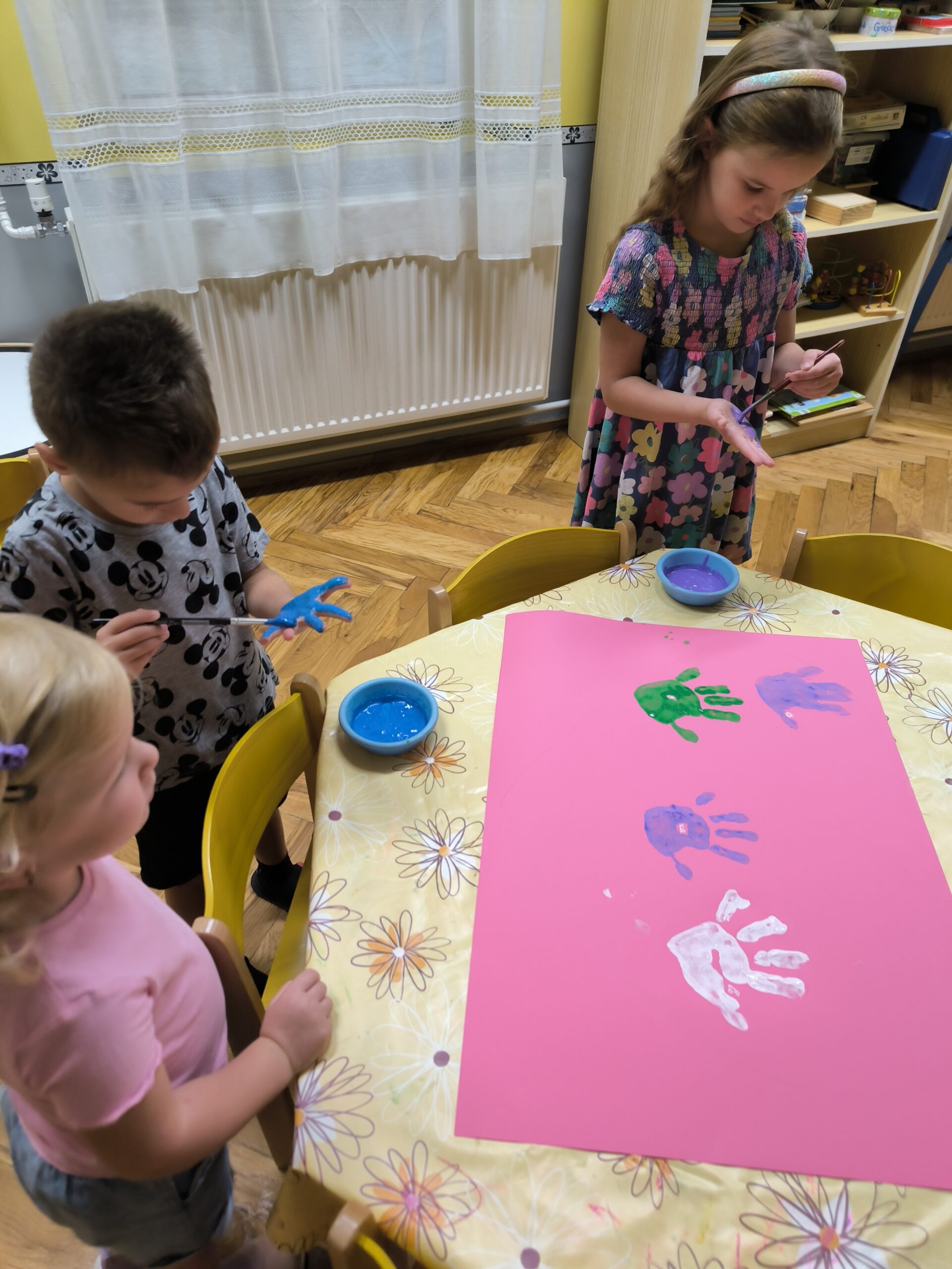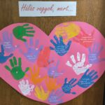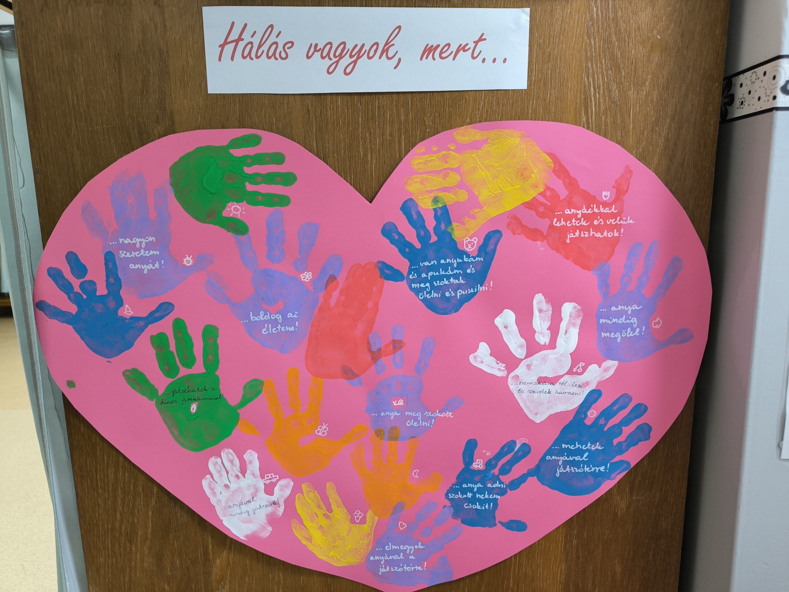 Zárásként egy hálaszívet készítettünk tenyérlenyomatokból, majd beleírtam, hogy a gyermekek miért hálásak. Pl.: Hálás vagyok mert…. boldog az életem! …anya elvisz a játszótérre! …anya sokszor megölel! …nemsokára tél lesz és szánkózhatok!