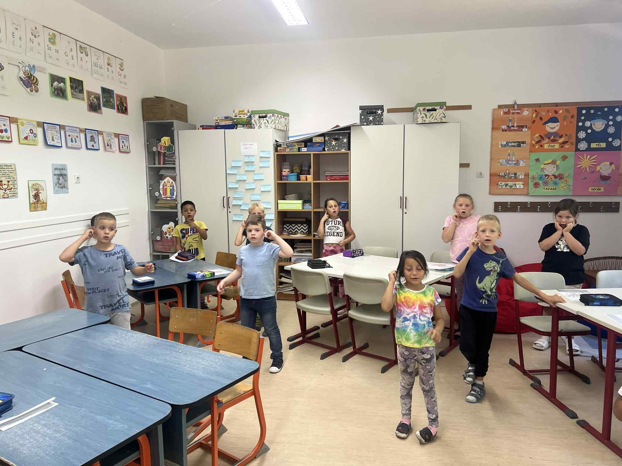 Nagy örömmel tanulták meg az „Ezzel látok…” kezdetű mondókát, amelyet azóta is szívesen ismételgetnek, akár a nap folyamán többször is. A gyerekek fehér szív alakú papírra rajzolták le, hogy miért hálásak, majd akik bátran vállalták, el is mesélték társaiknak. A kis szívek végül egy nagy piros szívre kerültek, így született meg a Hála szívünk, amely most díszíti a termet, és emlékeztet minket arra, mennyi mindenért lehetünk hálásak.