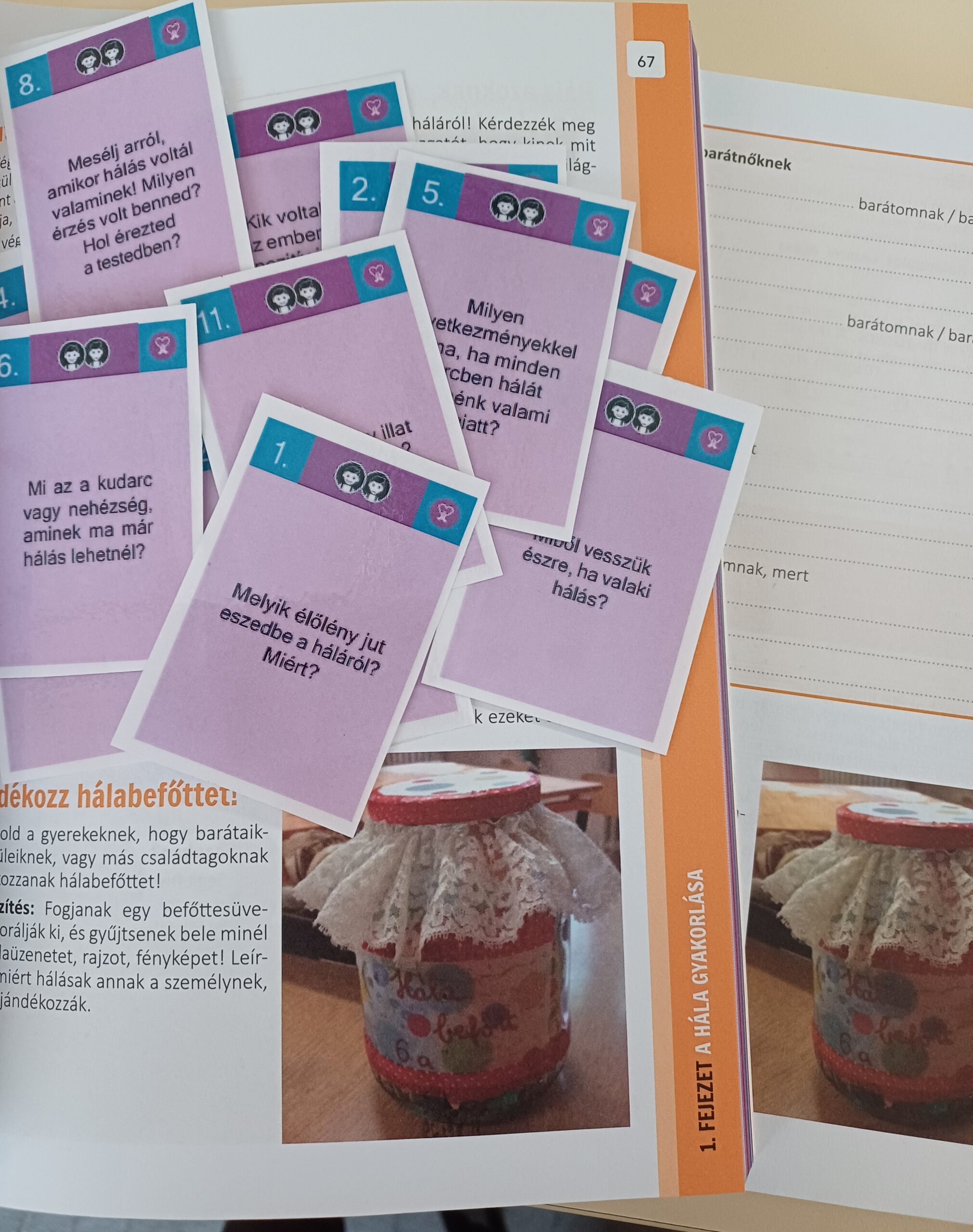 A hónap témájának feldolgozásához felhasználtam a tankönyv és a munkafüzet ajánlásait. Egy mozgásalapú relaxációs gyakorlattal kezdtük az órát, a „Napimádással”. Majd a téma feldolgozásához körben leülve hangolódtunk rá az óra témájára a hónap dalát meghallgatva. Asszociációs játékot hajtottunk végre a dal meghallgatása közben: Mi jut eszükbe ha azt a szót hallják, hogy hála? Egy szót Írtak le a post it-jukra. Saját gondolatok, tapasztalatok alapján közelítettük meg a témát. Elmondta mindenki, hogy a mai napon mi mindenért lehet hálás, milyen pozitív dolog történt vele ébredés óta. Felolvastam az Egy pohár tej történetét, megbeszéltük az alapján, hogy a hála nem feltétlenül kell, hogy arányban álljon a jócselekedetekkel. Párban feldolgozták a hálakártyák kérdéseit, nagyon eredményes válaszokat adtak a kérdésekre. Ki miért hálás, írja le a munkafüzet 12. oldalán található feladatlap kitöltésével.