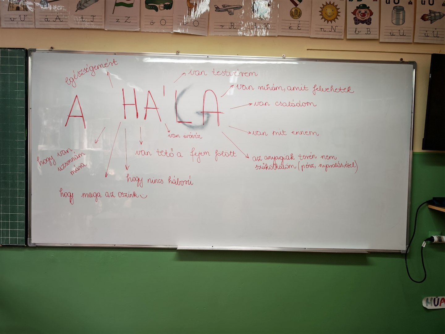 Elsőként egy pókhálóábra segítségével közösen megbeszéltük, hogy kinek mit jelent a hála fogalma. Minden tanuló elmondta, mire asszociál a „hála” szó hallatán, ezeket a gondolatokat pedig feljegyeztük a táblára.