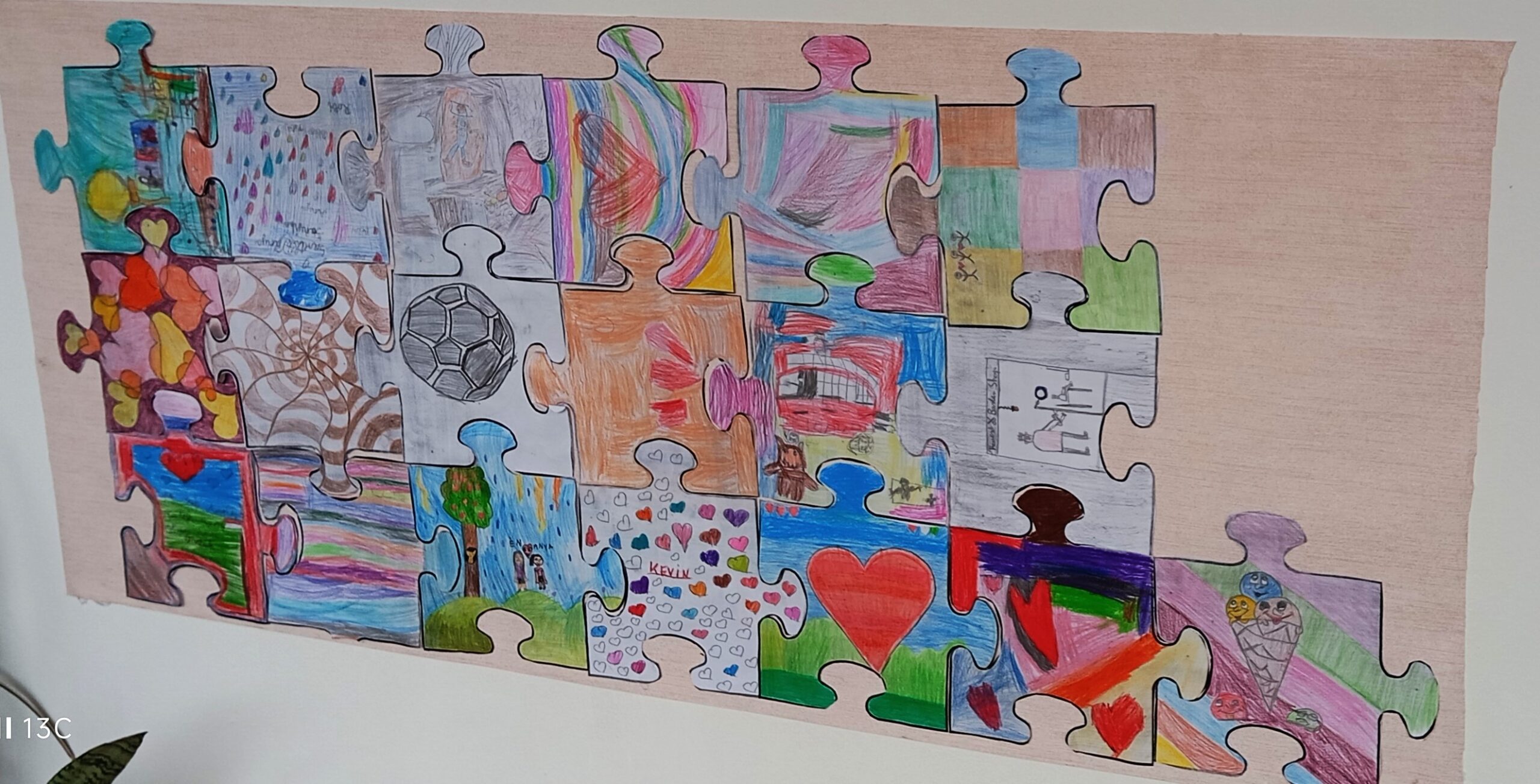 Természetesen a közös puzzle-kirakó is elkészült. Tevékenységünket érdeklődve figyelték a többi alsós és felsős osztály gyermekei is. Kérték, hogy ők is rajzolhassanak, melyet boldogan fogadtunk hisz az alkotás „Boldog Iskola pályázat” részeként valósult meg, melyet igazán reményteli és Boldog kezdetnek veszünk. A puzzle összeállítása során sikerült azt az élményt együtt megélnünk, hogyan válhatnak az egyéni gondolatok és érzések egy közös alkotás részévé. A színes, személyes darabokból álló kirakó a tanterem egyik meghatározó és vizuális eleme lett a szeptemberi hónapnak. Szeretettel vették körbe a gyermekek és próbálták felfedezni kinek mit rejt az alkotása.