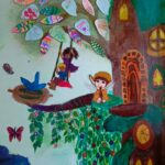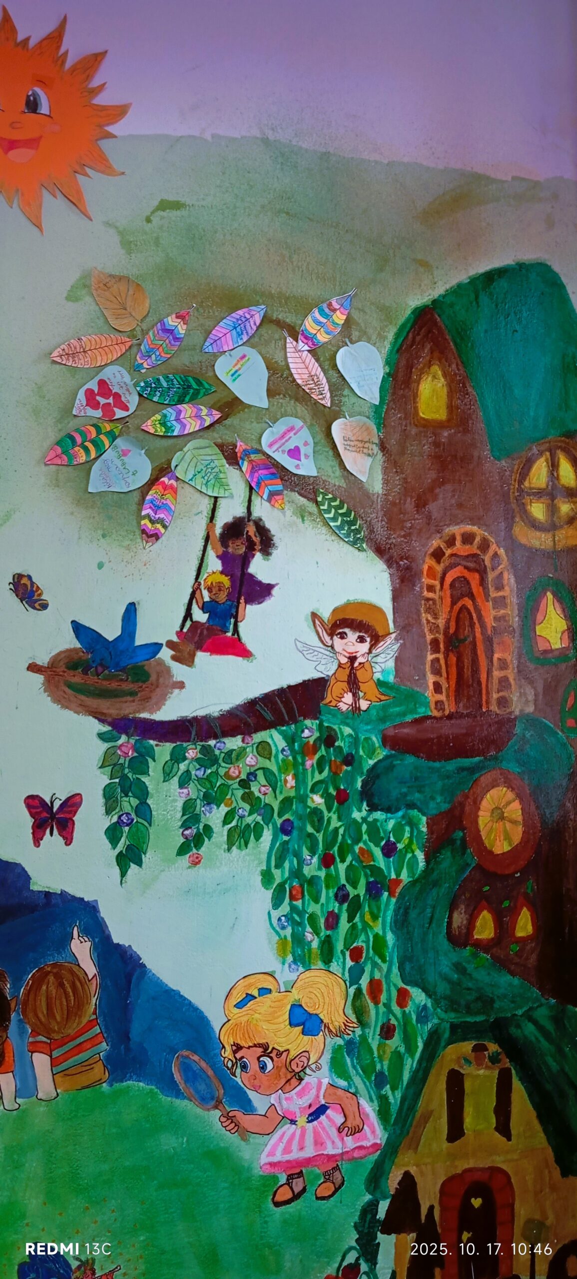 A foglalkozás középpontjában az a falra festett fa állt, amelyet tavaly az alsós csoporttal közösen készítettünk. Tudatosan őriztük meg ezt a közös alapot, mert szerettünk volna egy olyan felületet, amelyhez vissza lehet térni, illetve a gyerekek fejlődését is kíséri.