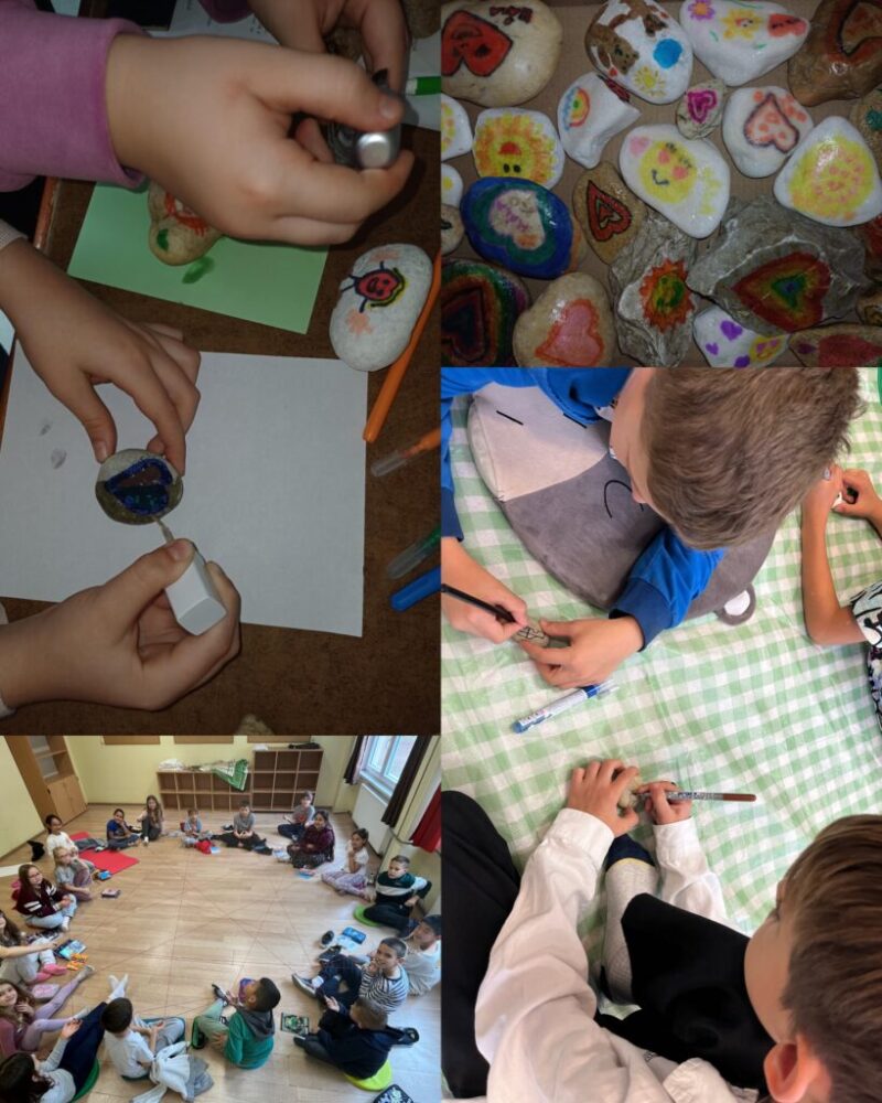 A gyerekekkel ebben a hónapban a háláról tanultunk. Ez előző hónaphoz hasonlóan most is készítettem tervezetet, melyet kollégáimmal is megosztottam. A foglalkozáson nagyon sokat beszélgettünk, készítettünk hálaleltárt, hálahálókat, hálakavicsokat. Az iskolában a hálakavicsok festésébe örömömre igazán sokan becsatlakoztak. Az elkészült kavicsokat karácsonykor kis szütyőkbe tesszük és szétszórjuk őket a városban, hogy az ott lakókat karácsony ünnepe alkalmából megajándékozzuk. 🙂
