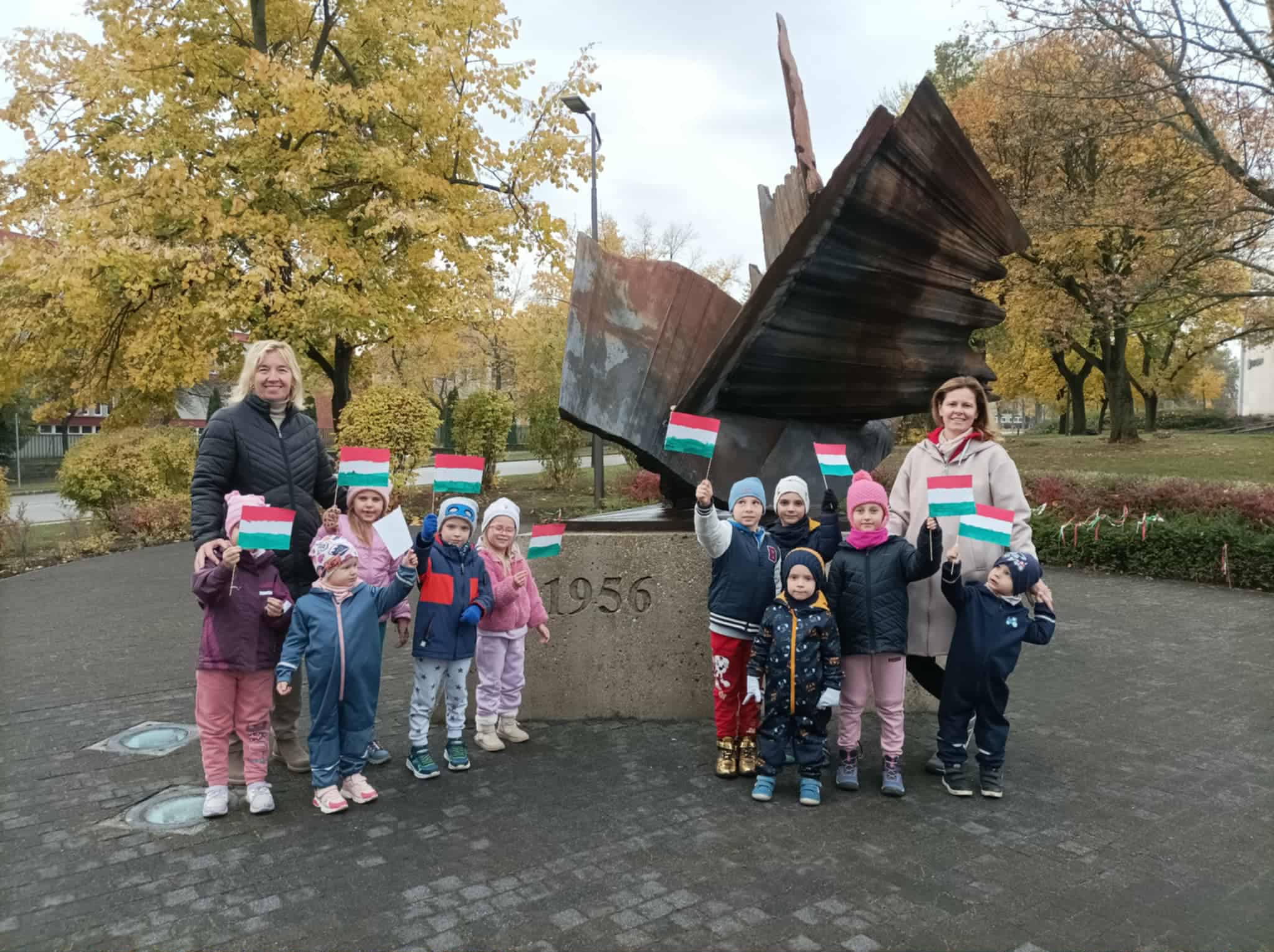 Az októberi időszak egyik fontos eseménye nemzeti ünnepünk. Az óvodáskorú gyermek életében fontosnak tartom a hagyományok ápolását és a hazaszeretetre nevelést. A pozitív érzelmi kötődés kialakítása közvetlen lakóhelyünkhöz, szülőföldünkhöz, hazánkhoz elengedhetetlen ahhoz, hogy egészséges felnőttekké váljunk. Elolvastuk és megbeszéltük a hálafa történetét. Összehasonlítottuk a szabadságharc során kialakult állapottal. Egy szomorú ország, aminek szintén fáj a lelke megpróbált kiszabadulni ebből a rabságból. Csakhogy nem a szeretetet hívták segítségül, hanem a fegyvereket. Hálát adtunk, hogy békében és szabadságban élhetünk. Van enni- ,innivaló, játék és járhatunk óvodába. Meghallgattuk a „Boldog vagyok” című dalt. Majd vidáman táncoltunk is rá.Készítettünk az udvaron egy mandala szívet. Zászlót festettünk, megbeszéltük a piros a forradalom, a fehér a nyugalom, béke, míg a zöld a remény színei. Megemlékeztünk a szabadságharc áldozatairól az emlékműnél. Hálát adtunk, hogy nagyszüleink, szüleink velünk lehetnek.