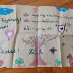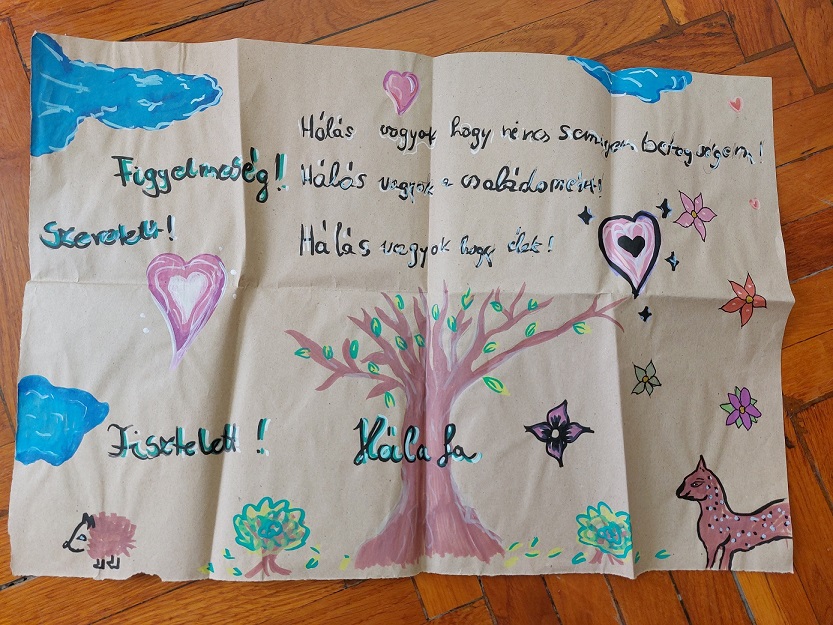 Szeptember hónapban a hála témáját jártuk körül a kabai 8. évfolyamosokkal. A témát két órán át dolgoztuk fel. Először megbeszéltük a hála szó jelentését, és azt, hogy mennyi mindenért, mennyire sok féle helyzetben is lehetünk hálásak. Ezt követően a tanulók 3-4 fős csoportokba rendeződtek és elkészítettek egy hála ábrát. A feladatuk az volt, hogy szabadon, önállóan asszociálva jelenítsék meg a plakátjukon a hálát. Az elkészült plakátokat bemutatták egymásnak is, röviden megmagyarázva az egyes rajzokat. Színes, ötletes megoldások születtek, többen fa ábraként, illetve összefordított tenyerekként jelenítették meg a hálát. A következő tanóráig feladatul kapták, hogy készítsenek egy hálanaplót, amelyben egy hétig minden napjukról leírnak egy dolgot, amiért hálásak. Ezt a következő óránk elején beszéltük meg. A gyerekek számos természetesnek gondolt dolgot is felsoroltak, de sokan említették pl. a családjukat, az egészségüket. Ezt követően ismét csoportokban dolgoztunk, egy-egy történetet alkottak meg, amiben megjelenik a hála. A gyerekek élvezték a feladatot, minden csoport ügyesen teljesítette.