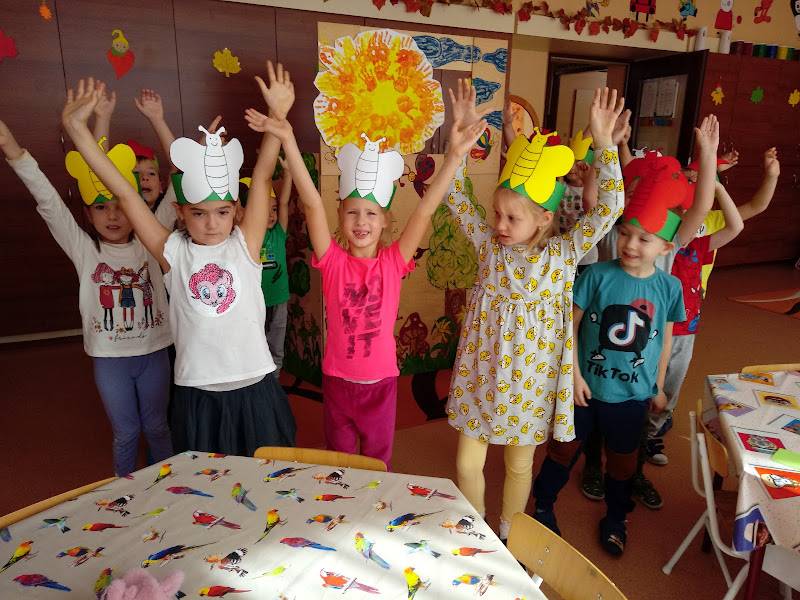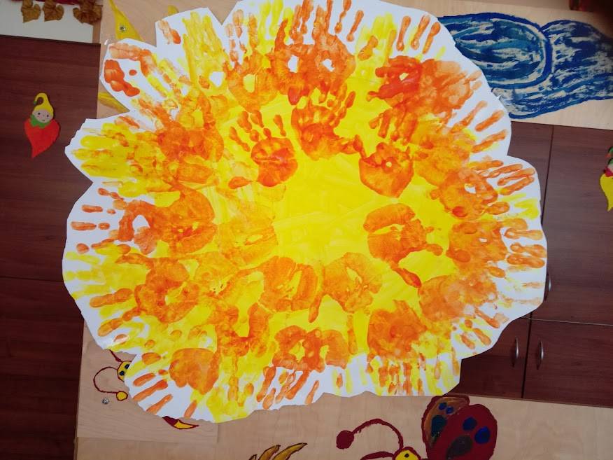 Hálásak vagyunk a Napocskának az életadó napsütésért, ezért a csoportunkban elkészítettük a saját Napocskánkat kéznyomatok segítségével, és eljátszottuk A három pillangó című mesét, amiben hálát adtak a pillangók is, hogy kisütött a Nap, és megszárította a szárnyukat, így újra tudtak repkedni a mezőn. Mi is így adunk hálát minden nap, ha süt a Napocska, és tudunk az udvaron játszani.
