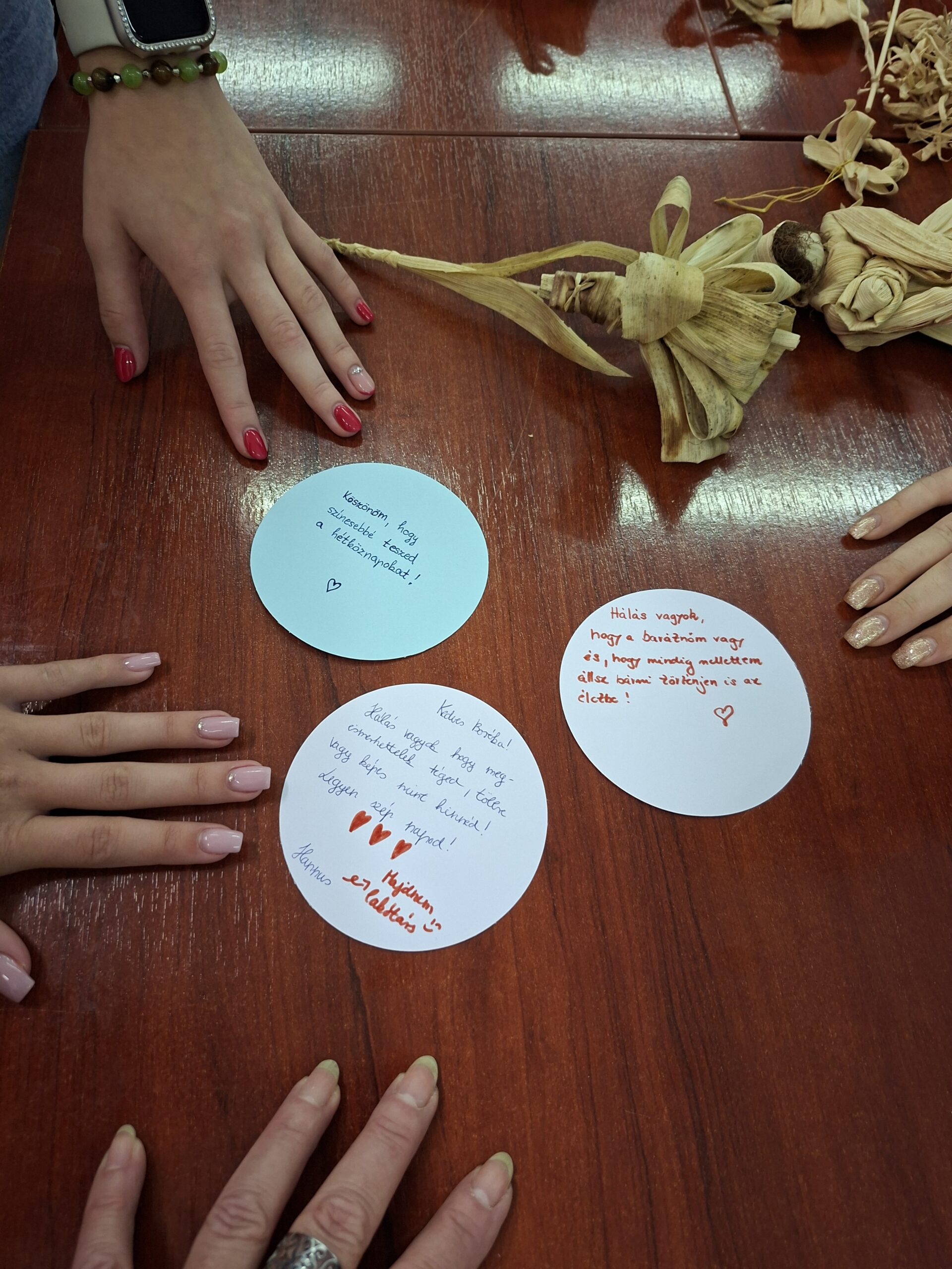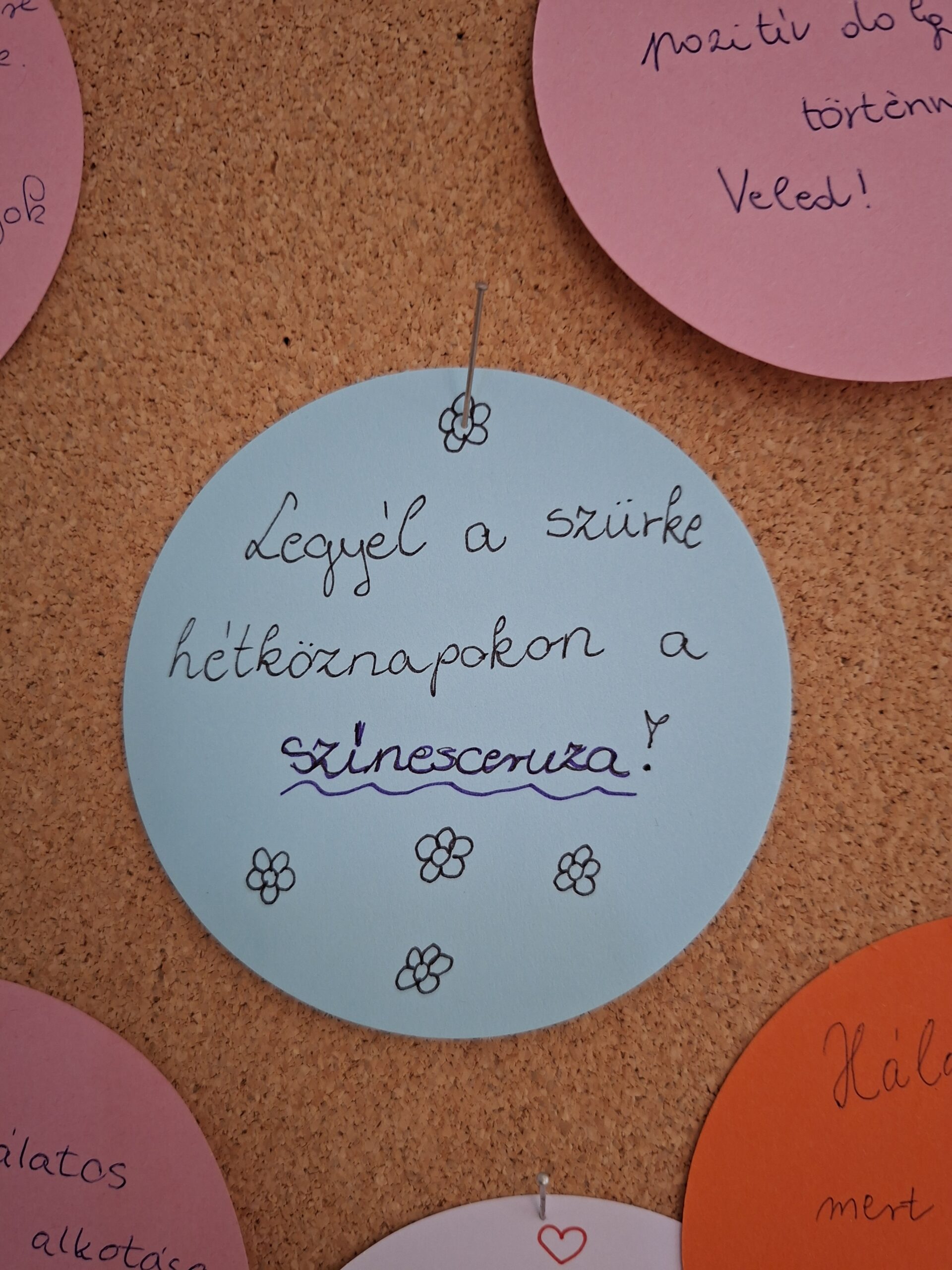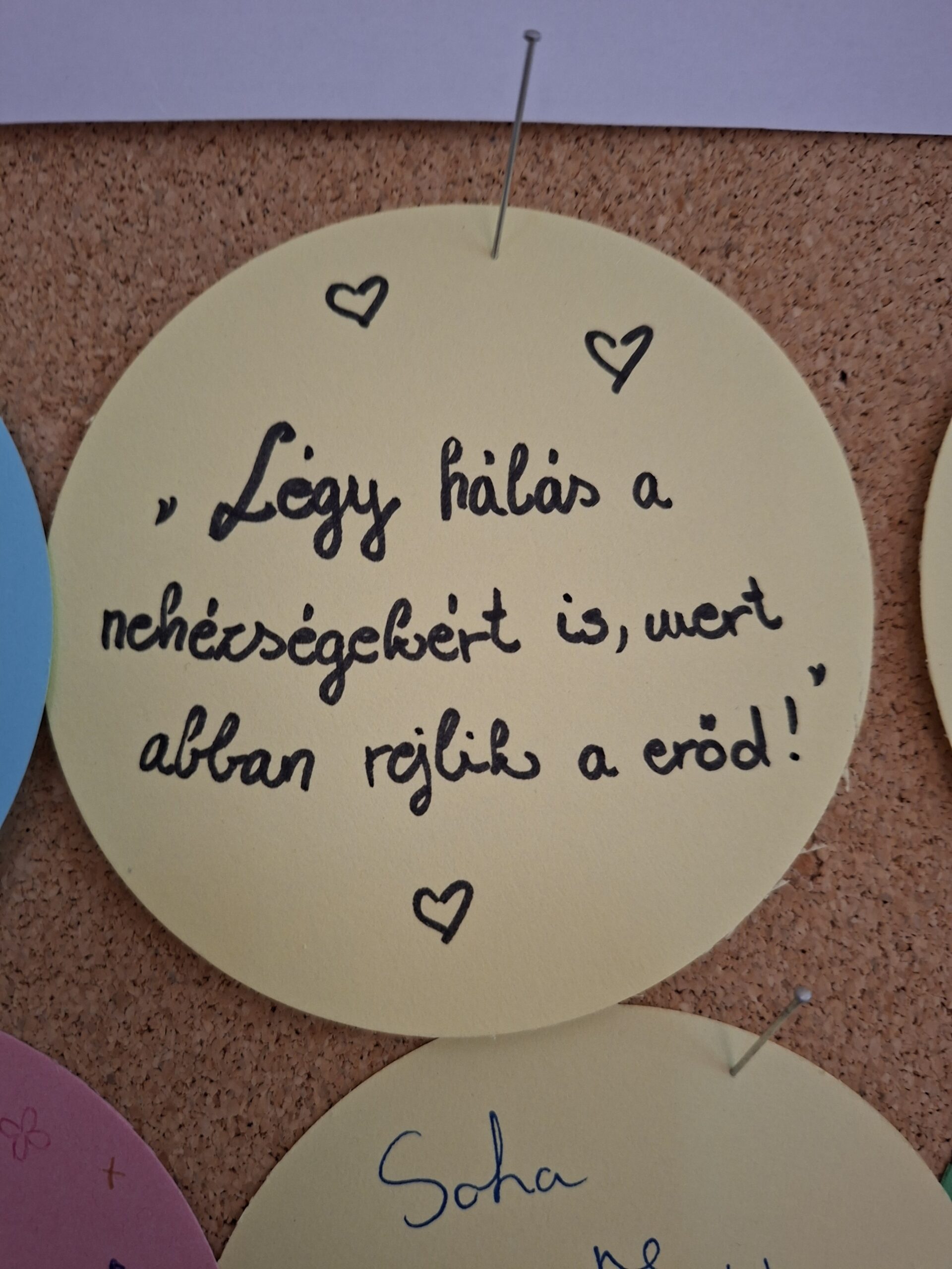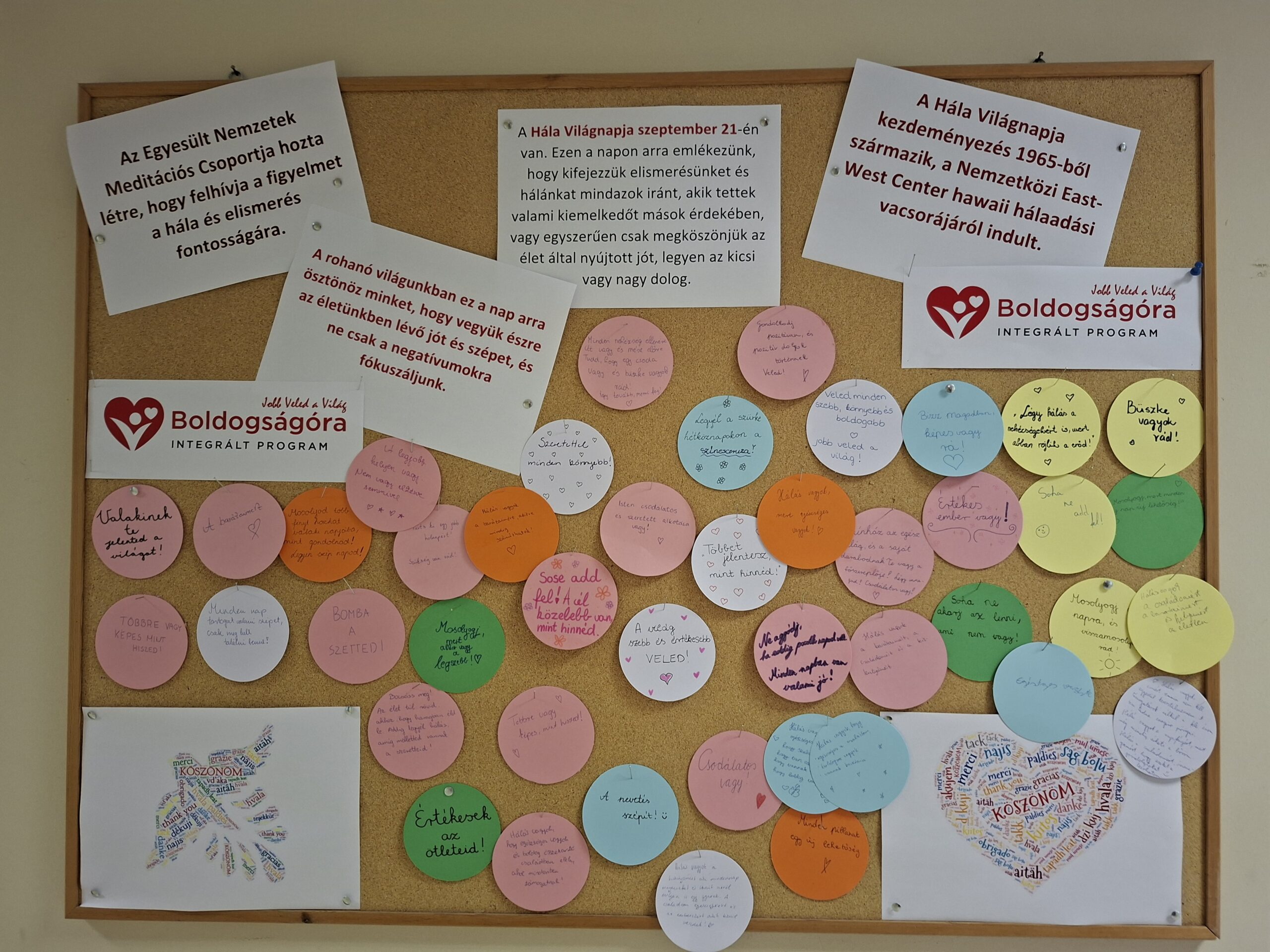 A rohanó világunkban ez a nap arra ösztönöz minket, hogy vegyük észre az életünkben lévő jót és szépet, és ne csak a negatívumokra fókuszáljunk. A Hála Világnapja szeptember 21-én van. Ezen a napon arra emlékezünk, hogy kifejezzük elismerésünket és hálánkat mindazok iránt, akik tettek valami kiemelkedőt mások érdekében, vagy egyszerűen csak megköszönjük az élet által nyújtott jót, legyen az kicsi vagy nagydolog. E nap kapcsán az egyetemistákat is megkértem az óráim utolsó 10 percében, hogy írjanak kedves bíztató üzenetet társaiknak, vagy valakinek, akinek szeretnék szebbé varázsolni a napját. A feladat a nap végére oly jól sikerült, hogy a folyosón lévő tábla tele lett kedves üzenettel. Voltak olyanok is, akik egymásnak ajándékozták az üzeneteket vagy elrejtették a társuk táskájába, zsebébe. Nagy sikert aratott a kezdeményezésem, mivel hála napból hála hét lett.