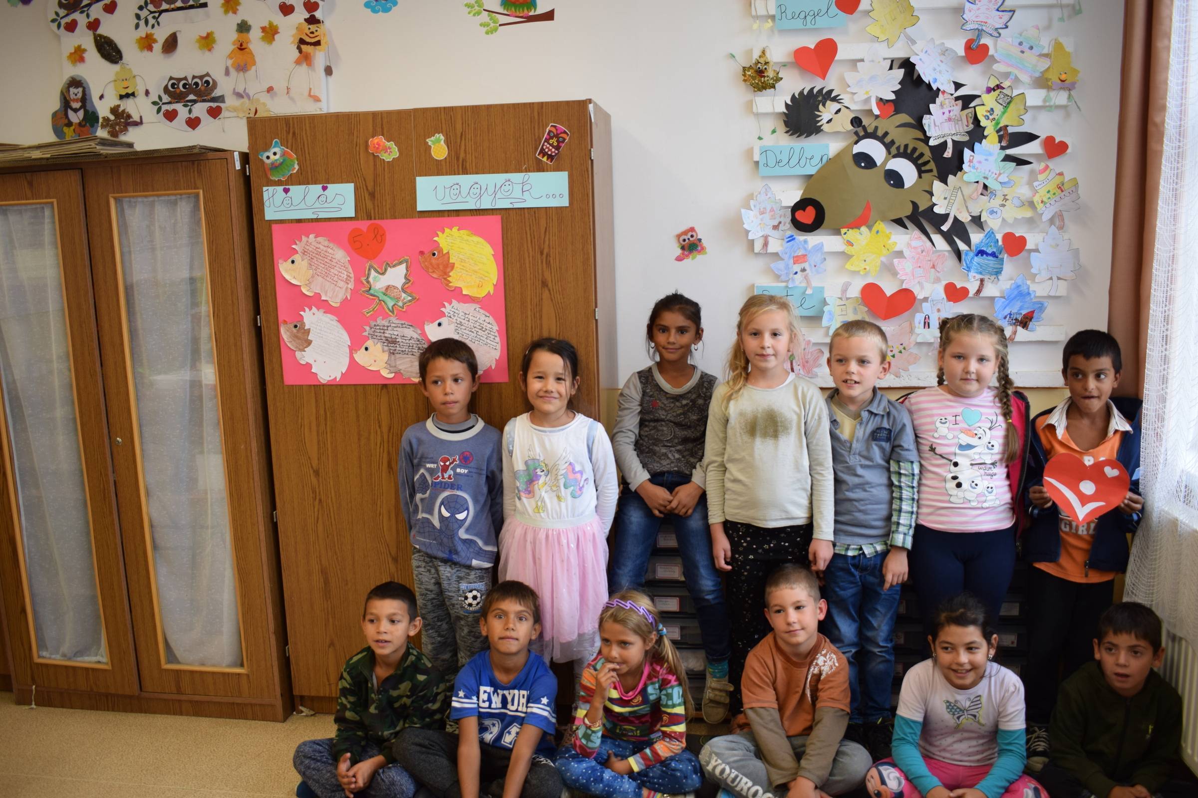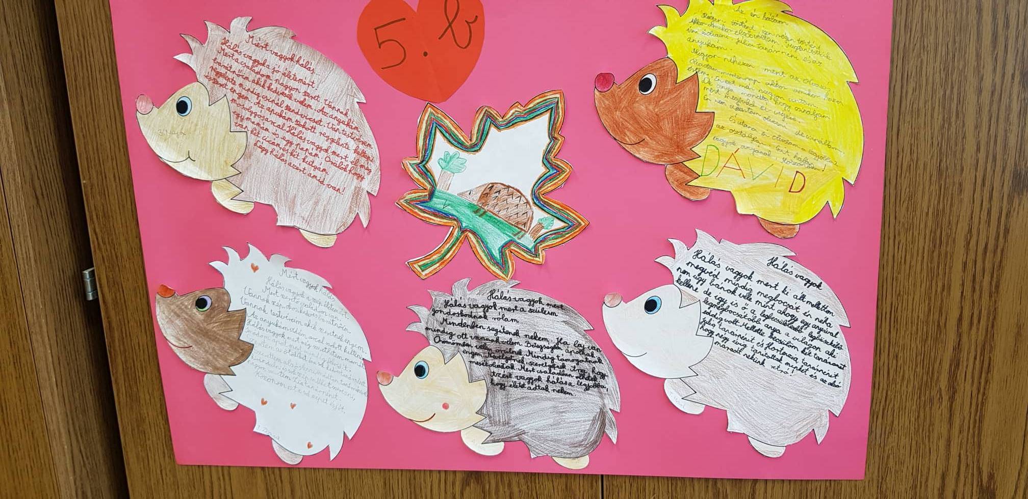 A „Boldogság Kuckónkba” szeptember elejétől beköltözött sünicsalád által a diákok árnyaltabban kifejezhették a hála szavait. A másodikosok ötletes, napszaknak megfelelő faleveles rajzocskákkal, míg az ötödikesek sünis fogalmazásokkal bővítették a felületet. A sok-sok gyerekalkotás, hálarajz, fogalmazás által a sünikék is hálásak lehettek, és boldogsággal a szívükben készülhettek téli álmukra.