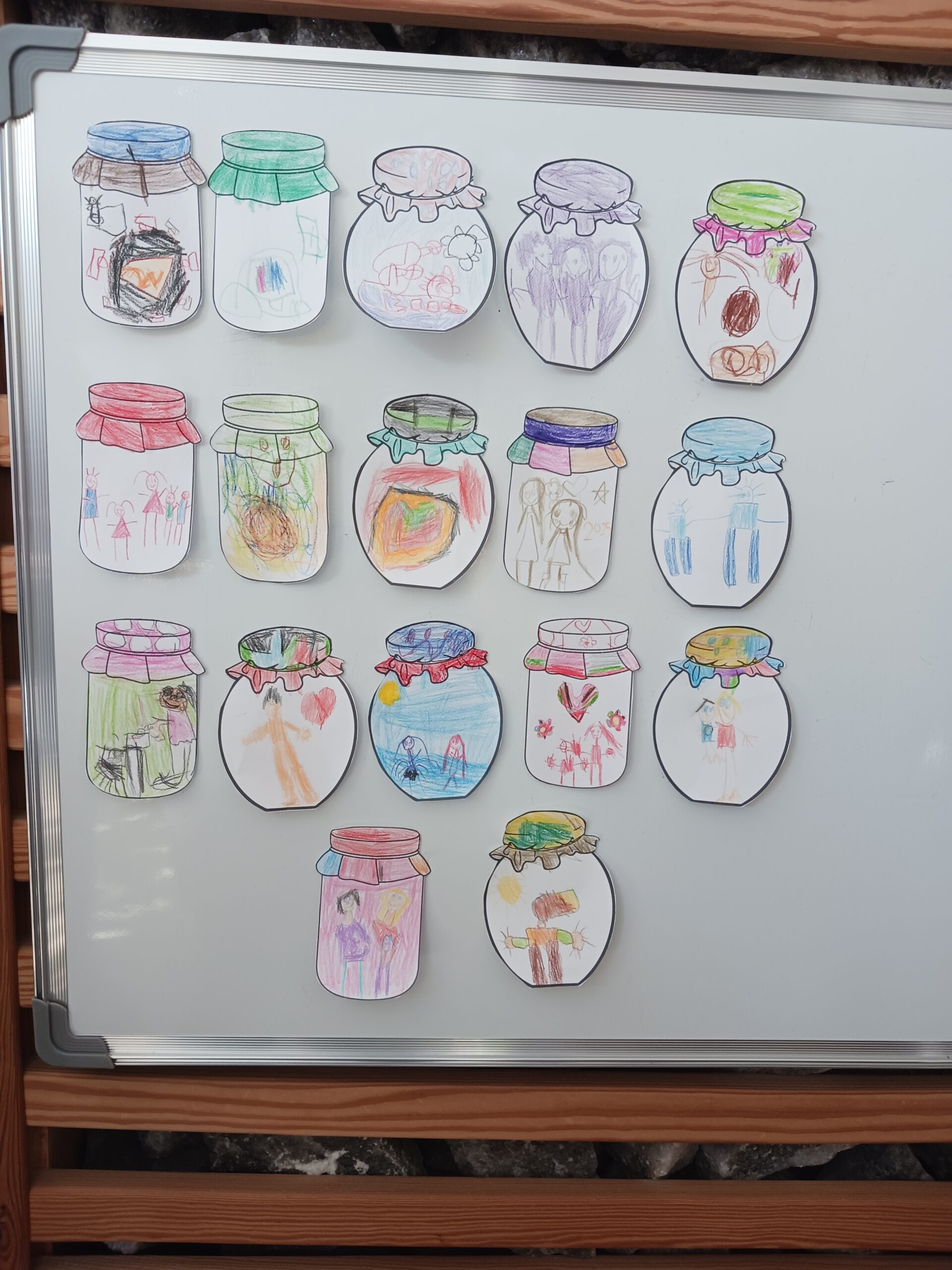 A foglalkozás végén a beföttesüvegekbe minden gyermek lerajzolhatott egy dolgot, amiért hálás.