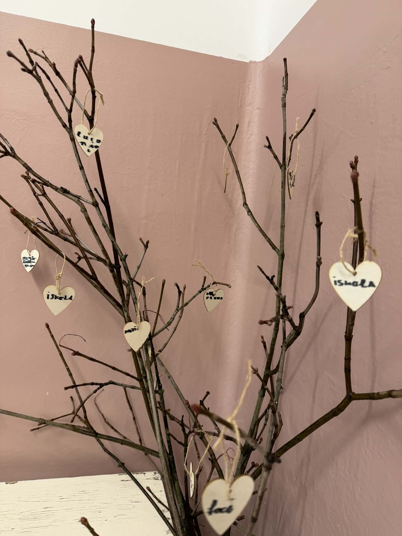 A hálafánkkal kezdtük a közös munkát, amelyet még személyesebbé tettünk azzal, hogy a gyerekekkel együtt válogattuk hozzá az ágakat. A fa egyik legszebb ékessége a hálaszív, amely mindig elérhető: bármikor felírhatják rá, miért hálásak éppen. Igazán örömteli látni, ahogy napról napra egyre több szív kerül fel rá.