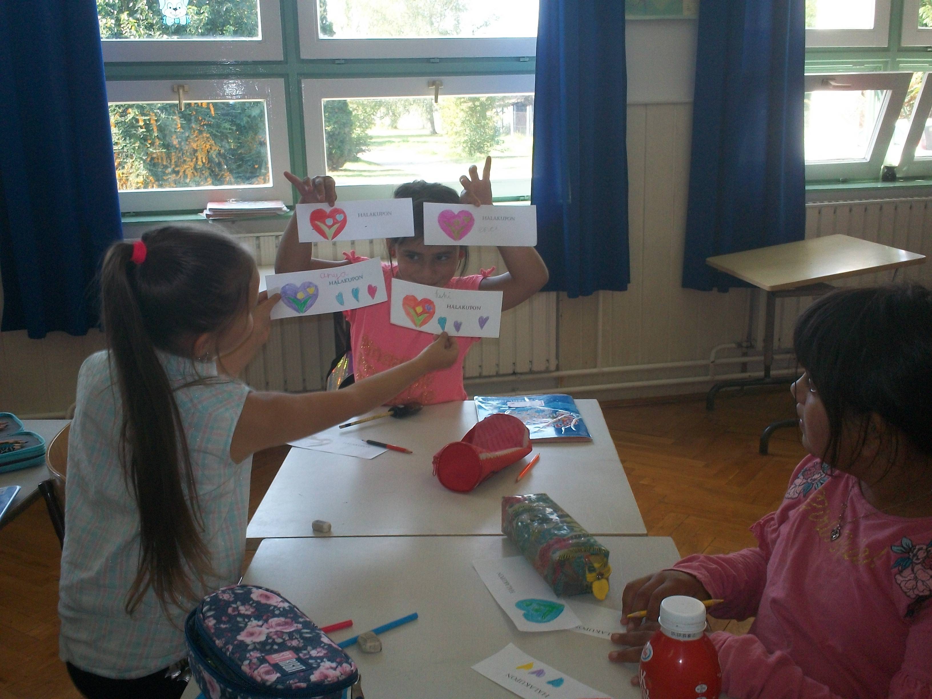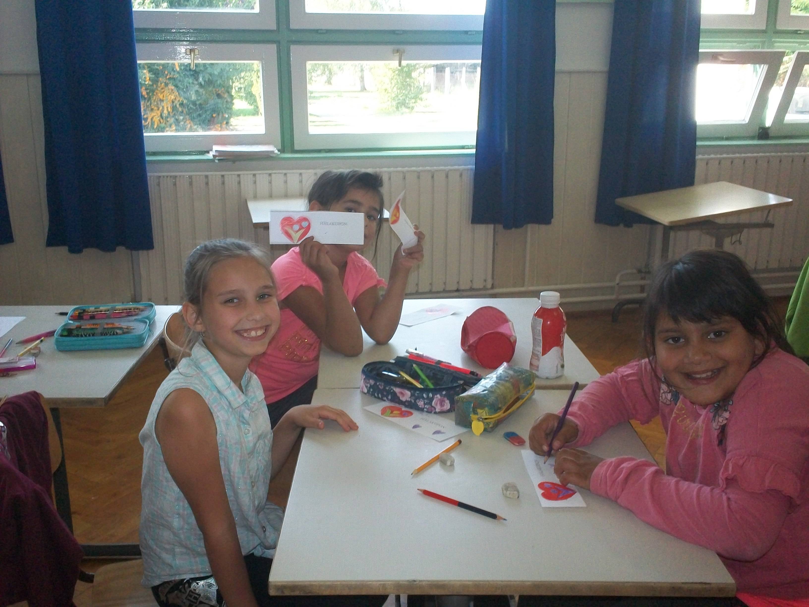 A következő órán hálakuponokat készítettünk. Én is kaptam. Az egyiket a következő szöveggel, „azért, hogy kibírja velünk, hogy mindig az agybajt hozzuk magára”. (Egyik negyedikes adta.)