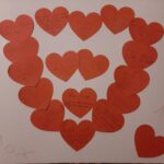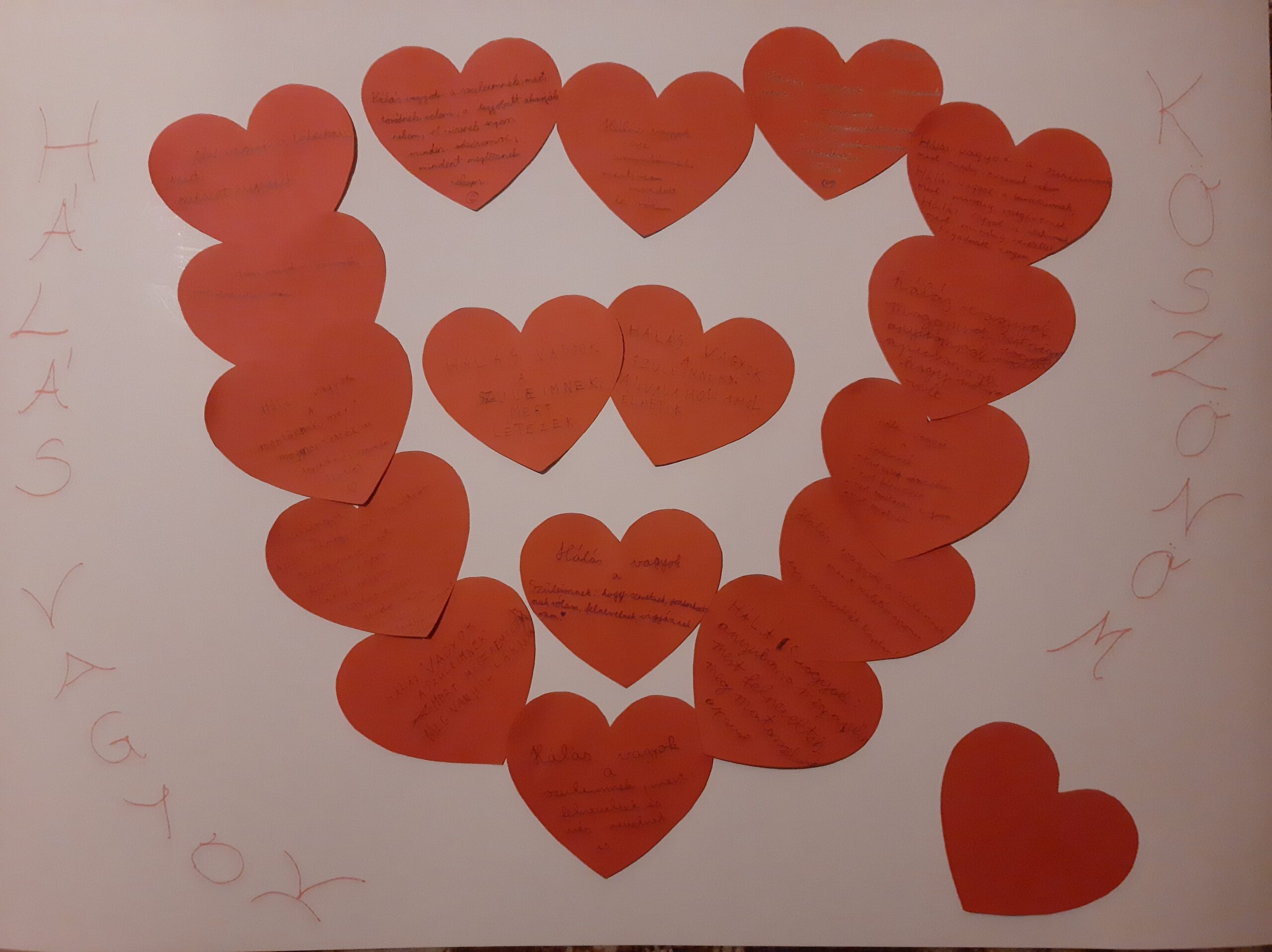 Az előre elkészített piros papírszívekre a gyerekek írták rá azt a hála mondatot, ami bennük megfogalmazódott a beszélgetés nyomán. Egy nagy szívformában rendeztük el hálaszívünket.