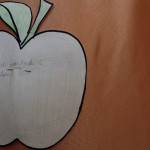 A harmadik osztályosokkal hála függönyre raktuk az almákat. Minden gyerek ráírta miért hálás.