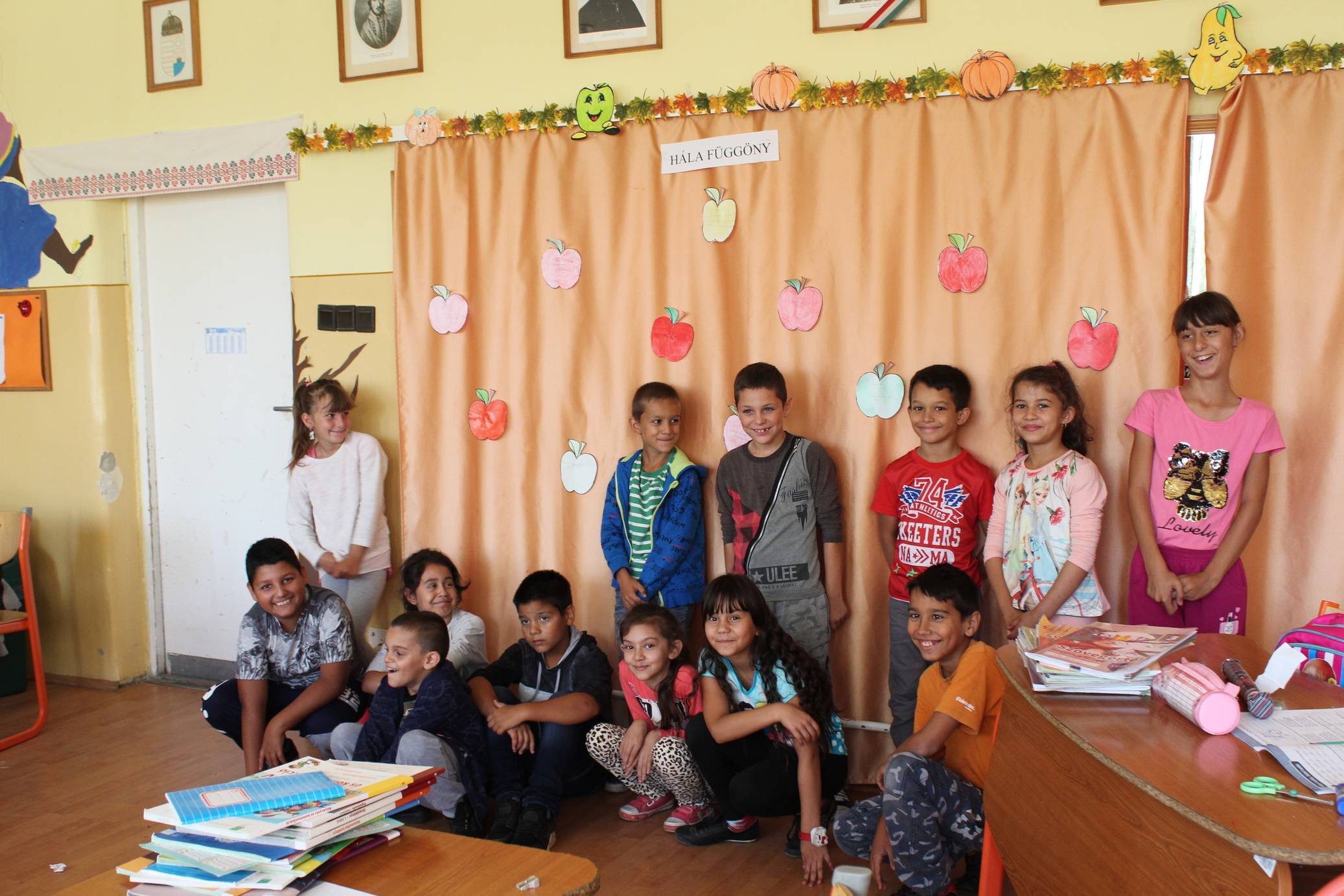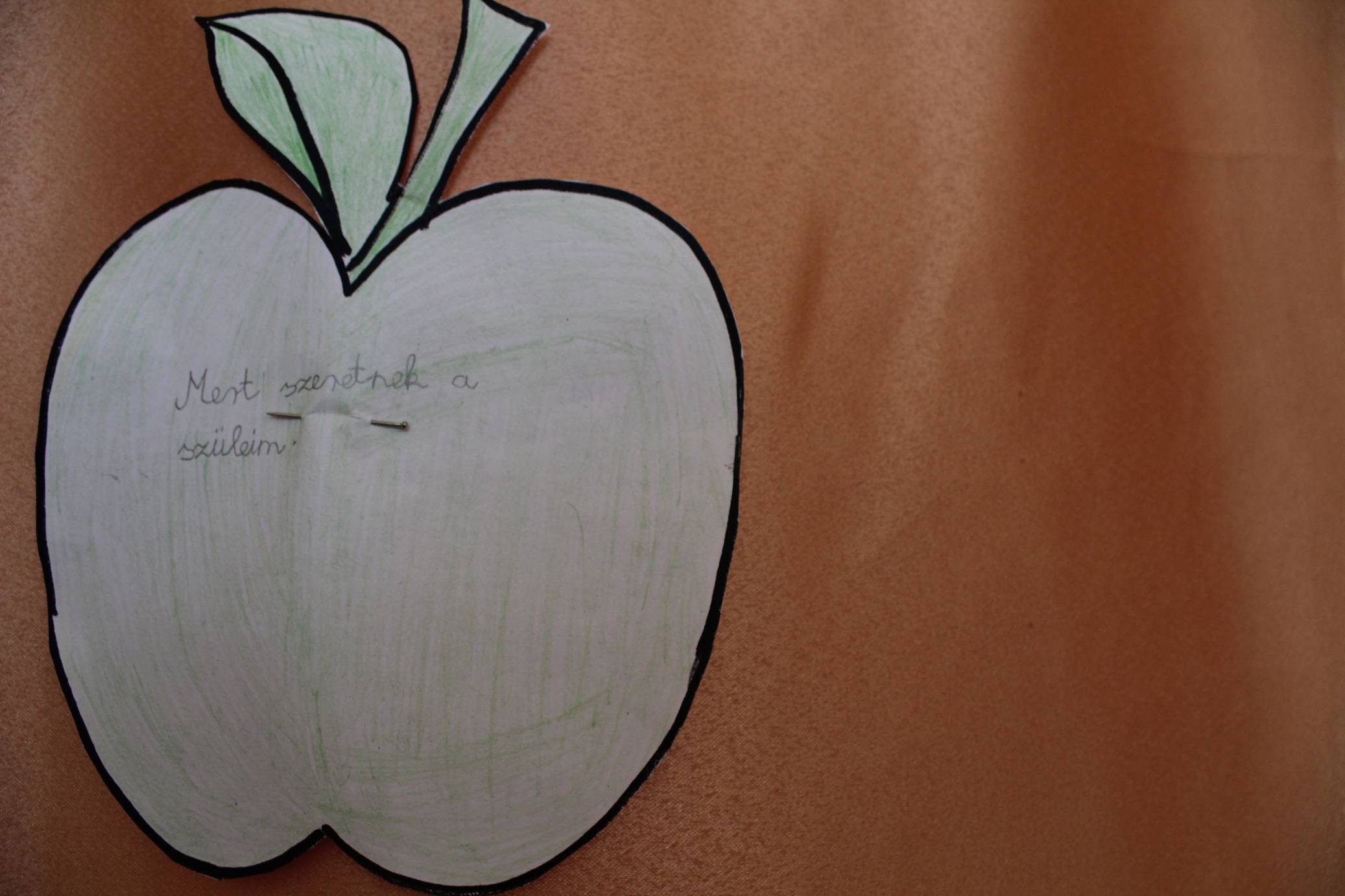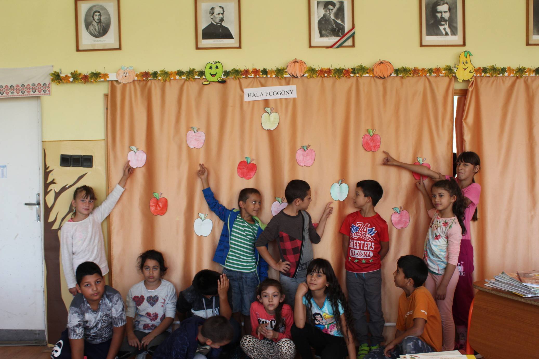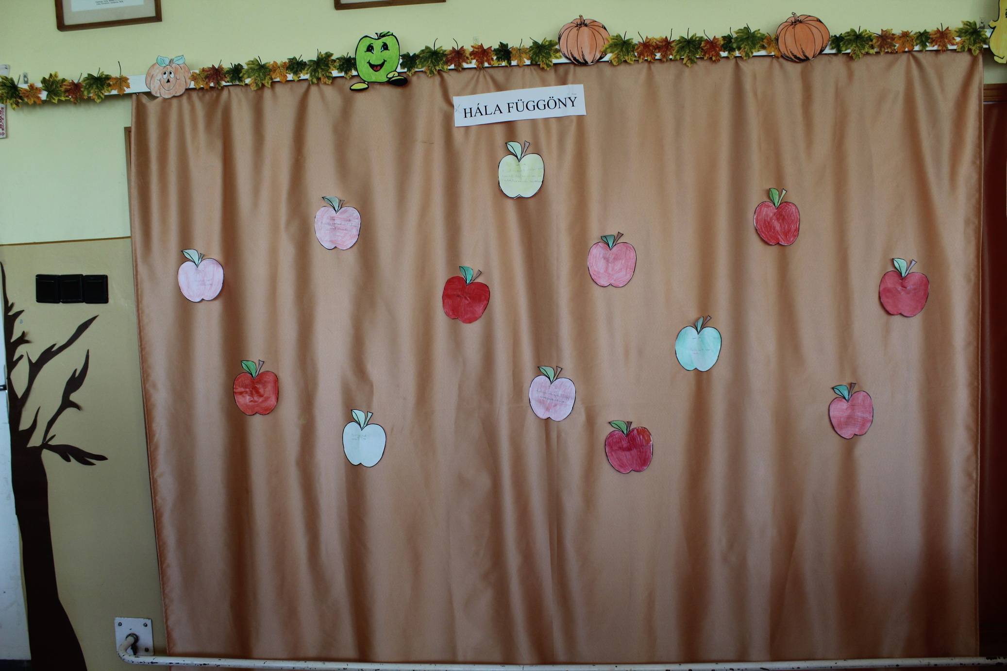 A harmadik osztályosokkal hála függönyre raktuk az almákat. Minden gyerek ráírta miért hálás.