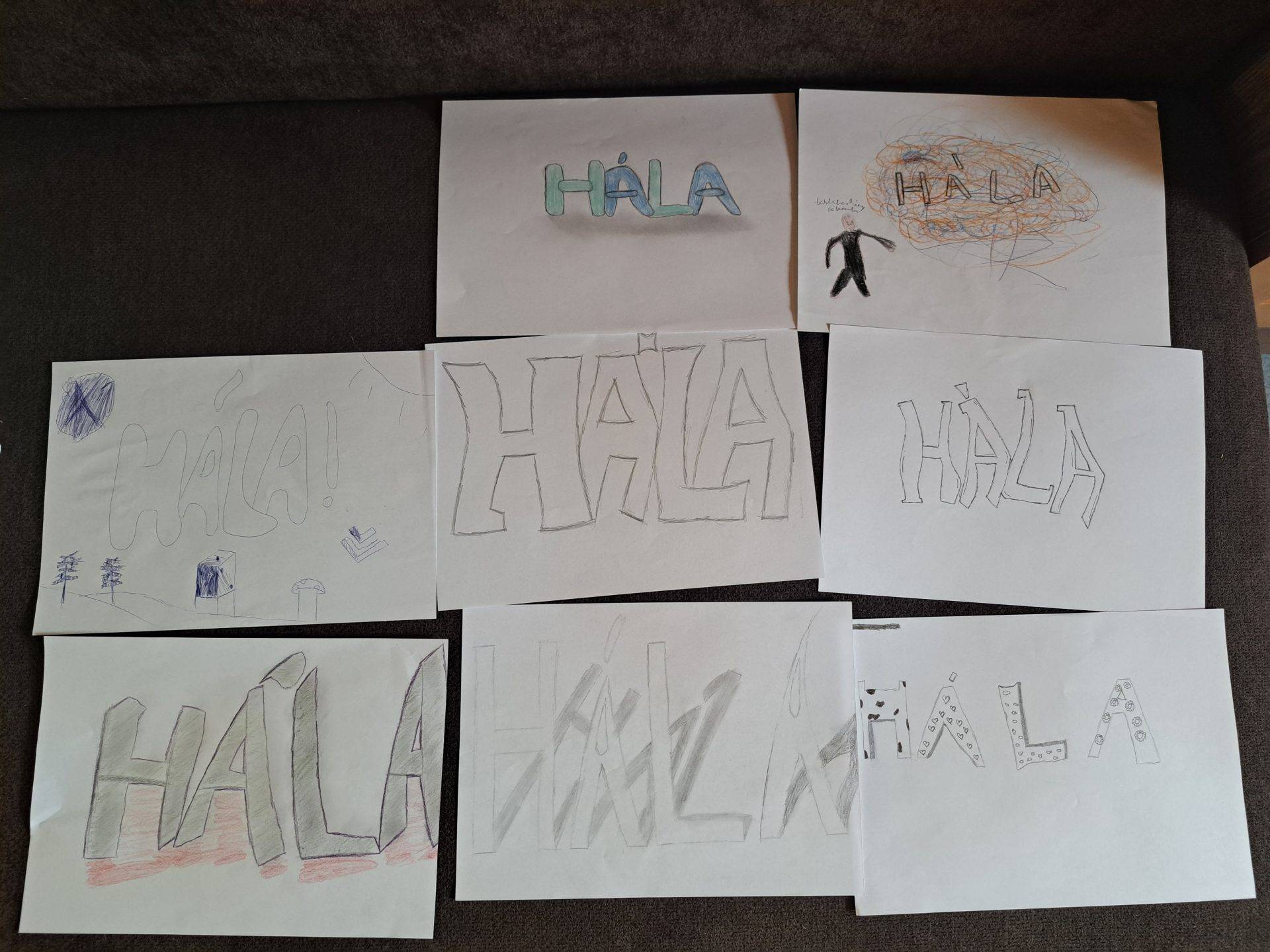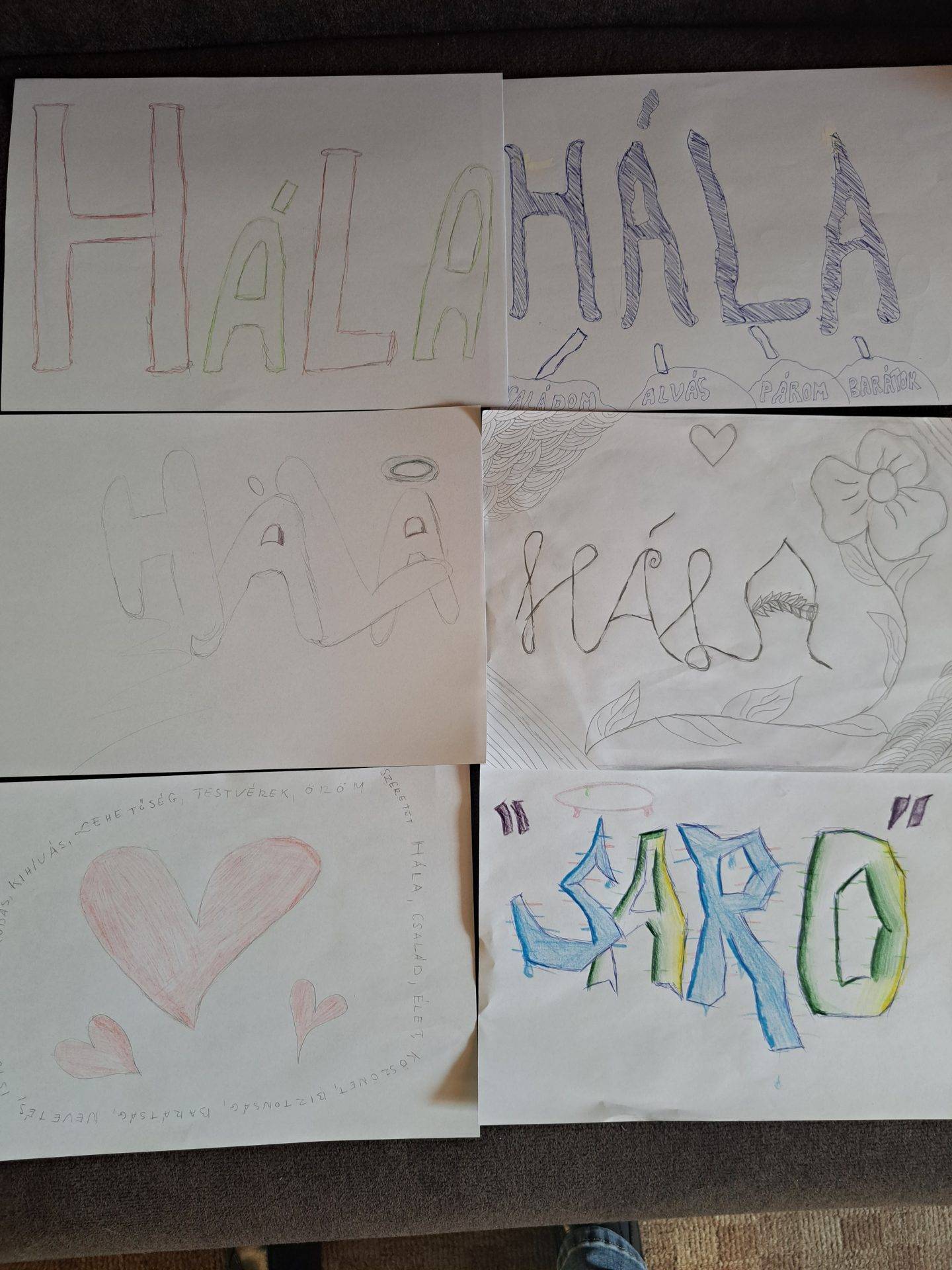 Feladatok közül a Hála graffitit választottuk. A feladat tetszett az osztálynak, voltak, akik többen ötleteltek és készítették el graffitjüket, majd az óra végén kiállítást rendeztünk az alkotásokból.