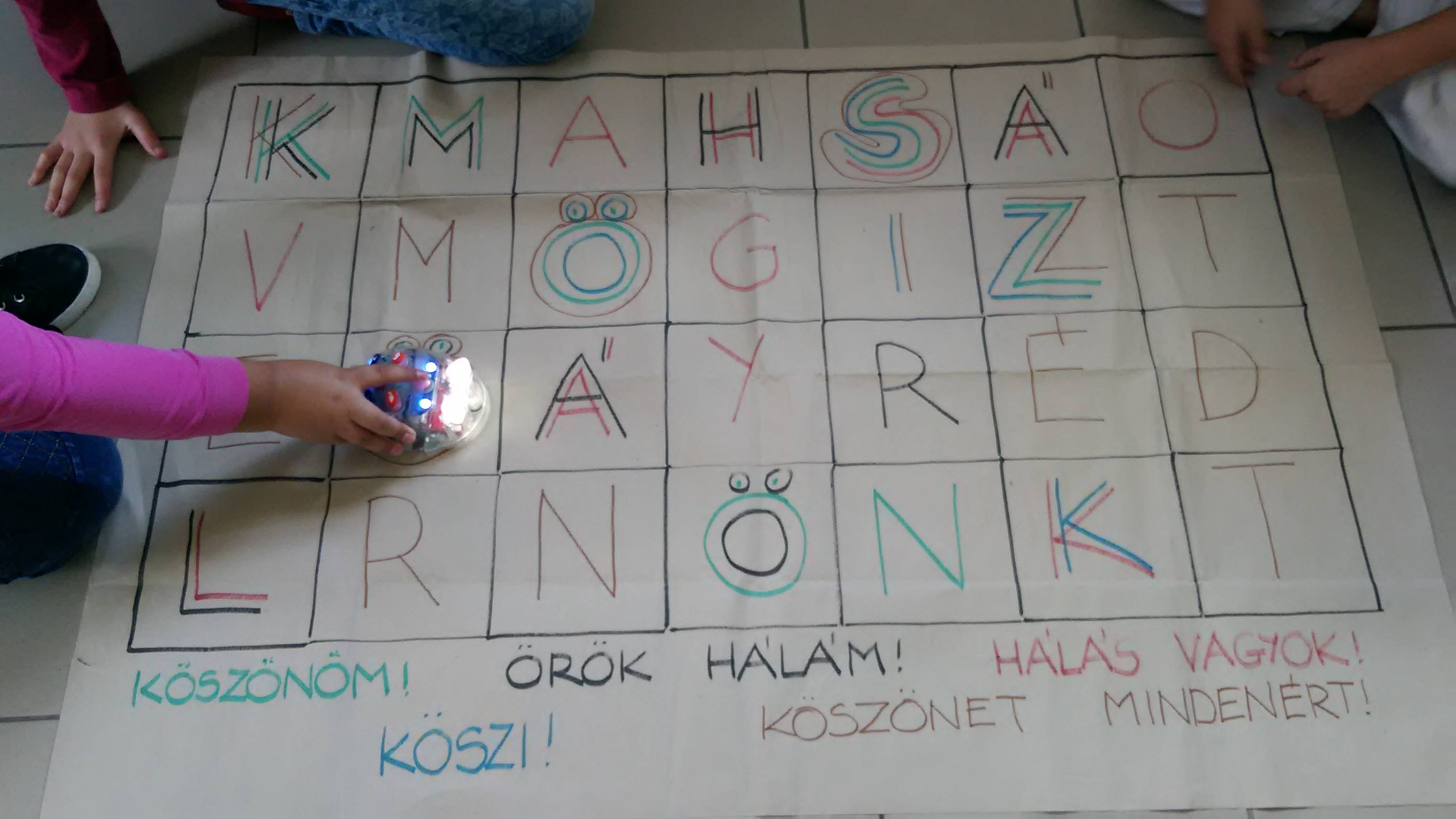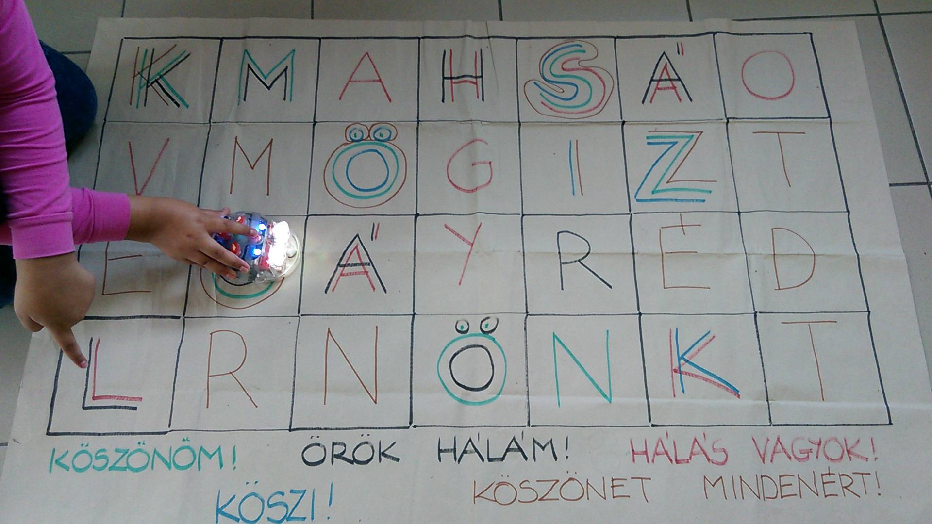 A hála szavait programoztuk be és gyűjtöttük fel betűnként a betűhálóról a robotkaticákkal.
