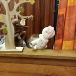 A mese bevezetése képen, három találós kérdést mondtam a gyerekeknek. Az első a medvéről szólt, miután kitalálták, elővetem a maci bábot. A második a süniről, a harmadik a nyusziról. Miután mind a hármat kitalálták, elindítottam Bagdi Bella: Boldog vagyok című dalát, és bementem a bábparaván mögé és eljátszottam a Maci bajban van című mesét a gyerekeknek. Utána megbeszéltük, hogy mi volt a maci baja, mi történt a mesében? Rávezettem őket arra, hogy mi lehet a hála fogalma. Elmondták, összeszedték gondolatikat, hogy miért lehetünk hálásak az életünkben. Eljutottunk oda, hogy a napért is hálás lehet ember, állat, minden.