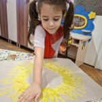Közösen elkészítettük a hála napocskánkat. Körbe álltuk az asztalt, elindítottam újra a hála dalt, bekentem a jobb kezüket sárga festékkel, és lenyomták a kezüket a csomagolópapírra. Végül elkészült a hála napocskánk, amit feltettünk a csoportszobánk falára, emlékeztetőül, hogy mindenki hálás valamiért.