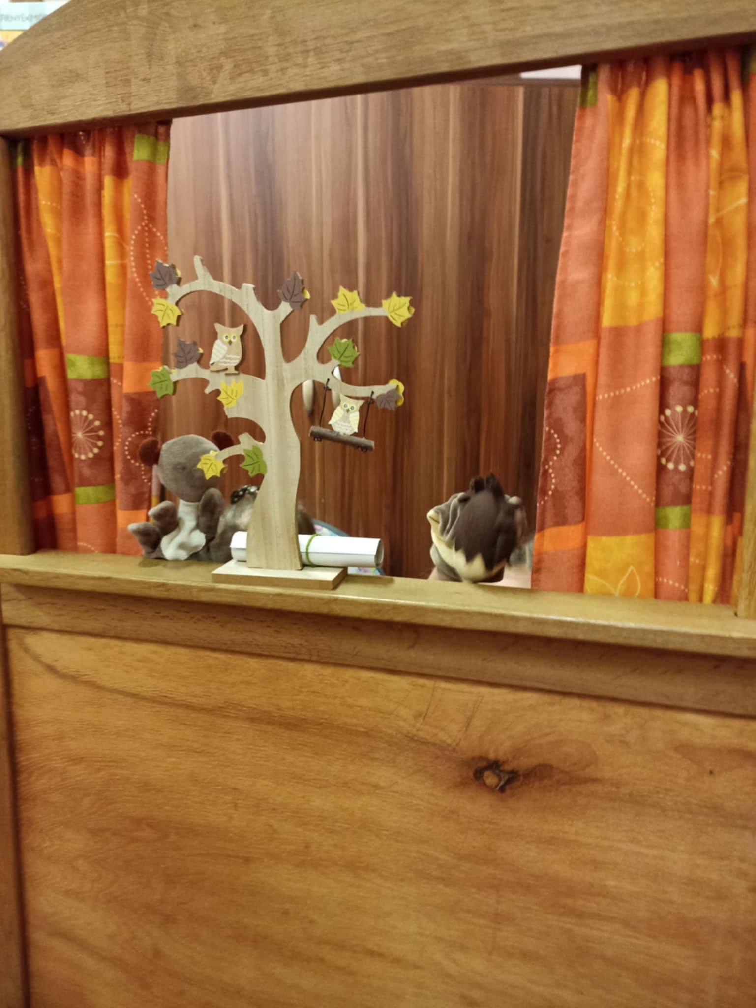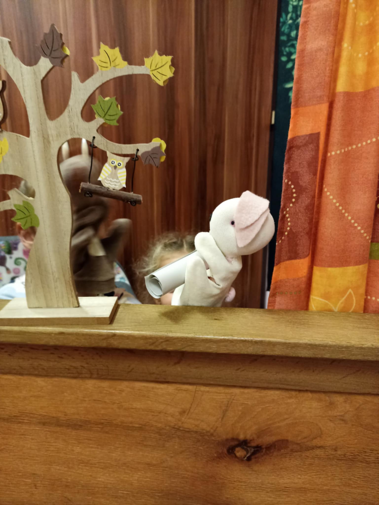 A mese bevezetése képen, három találós kérdést mondtam a gyerekeknek. Az első a medvéről szólt, miután kitalálták, elővetem a maci bábot. A második a süniről, a harmadik a nyusziról. Miután mind a hármat kitalálták, elindítottam Bagdi Bella: Boldog vagyok című dalát, és bementem a bábparaván mögé és eljátszottam a Maci bajban van című mesét a gyerekeknek. Utána megbeszéltük, hogy mi volt a maci baja, mi történt a mesében? Rávezettem őket arra, hogy mi lehet a hála fogalma. Elmondták, összeszedték gondolatikat, hogy miért lehetünk hálásak az életünkben. Eljutottunk oda, hogy a napért is hálás lehet ember, állat, minden.