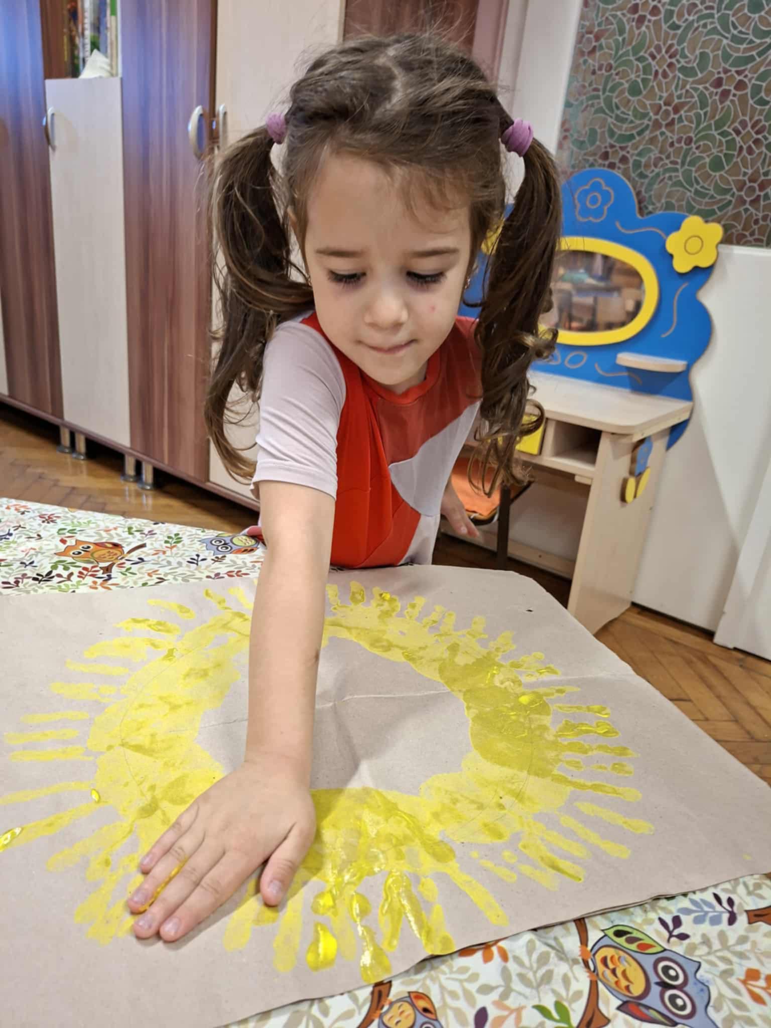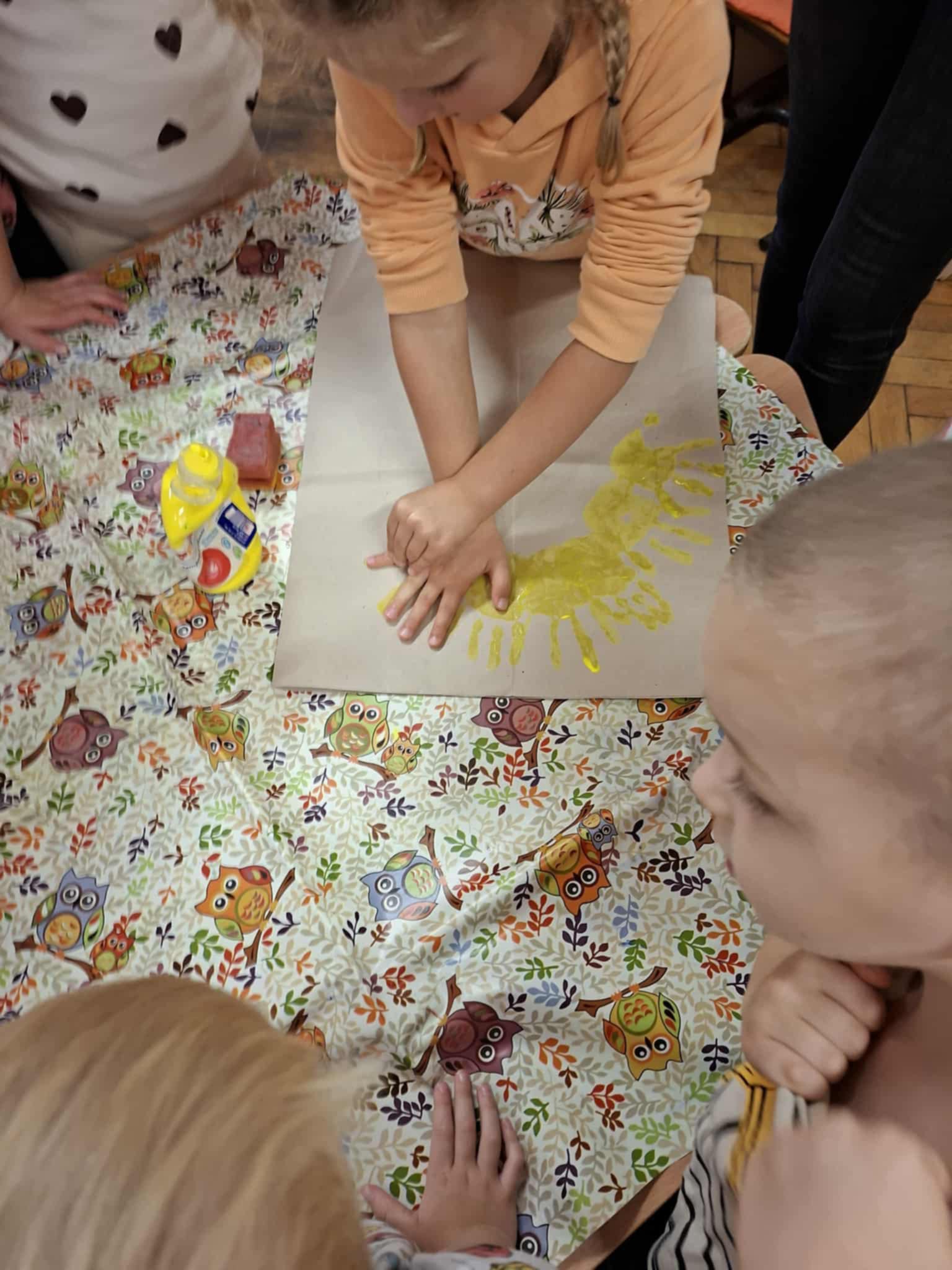 Közösen elkészítettük a hála napocskánkat. Körbe álltuk az asztalt, elindítottam újra a hála dalt, bekentem a jobb kezüket sárga festékkel, és lenyomták a kezüket a csomagolópapírra. Végül elkészült a hála napocskánk, amit feltettünk a csoportszobánk falára, emlékeztetőül, hogy mindenki hálás valamiért.