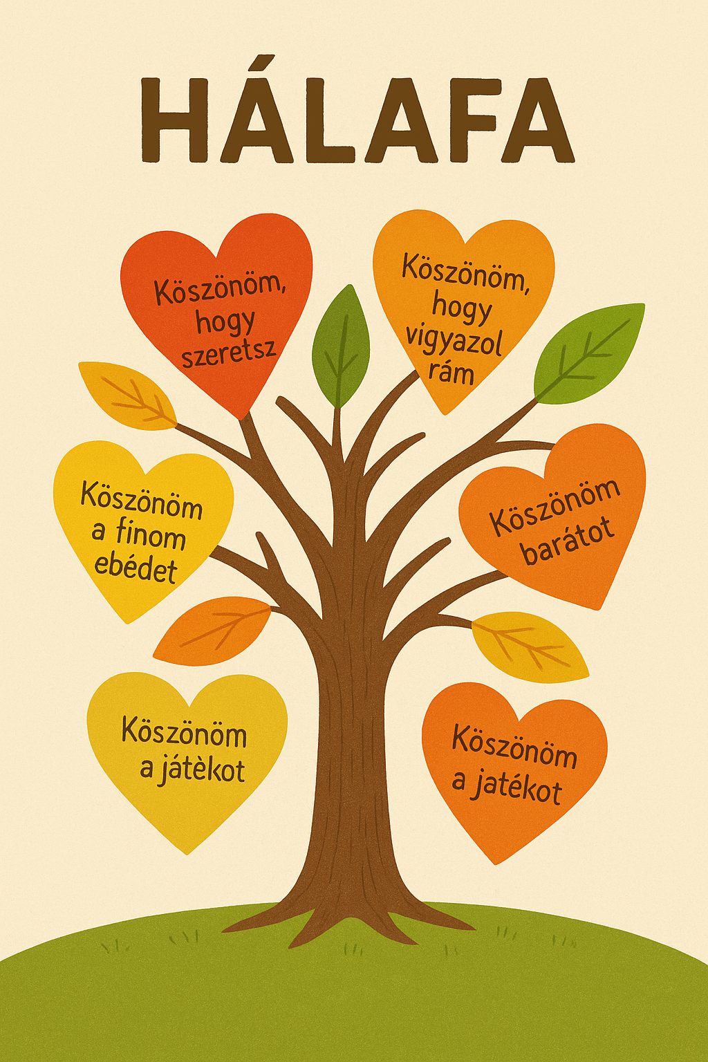 A hála azt jelenti, hogy észrevesszük és megbecsüljük mindazt a jót, amit mások adnak nekünk – legyen az egy mosoly, egy kedves szó, vagy akár egy finom reggeli. A kicsik számára a hála megélése nem nagy dolgokról szól, hanem apró örömökről, amelyeket minden nap megtapasztalhatnak. A foglalkozás során a gyerekek beszélgettek arról, miért jó érzés kimondani a „köszönöm”-öt, és hogy ezzel örömet szerezhetnek másoknak is. Játékos formában megosztották, kiknek hálásak, majd rajzzal kifejezték gondolataikat. A közös „Hálafa” elkészítése segített abban, hogy lássák: sok mindenért lehetünk hálásak, és mennyi szeretet vesz körül bennünket a mindennapokban. Mindenki elmondta , hogy ki miért hálás , én pedig egy kis papírszívre felírták és ebből készítettünk egy közös hálafát . Ez erősíti a pozitív gondolkodást, a barátságokat és a közösségi élményt is.