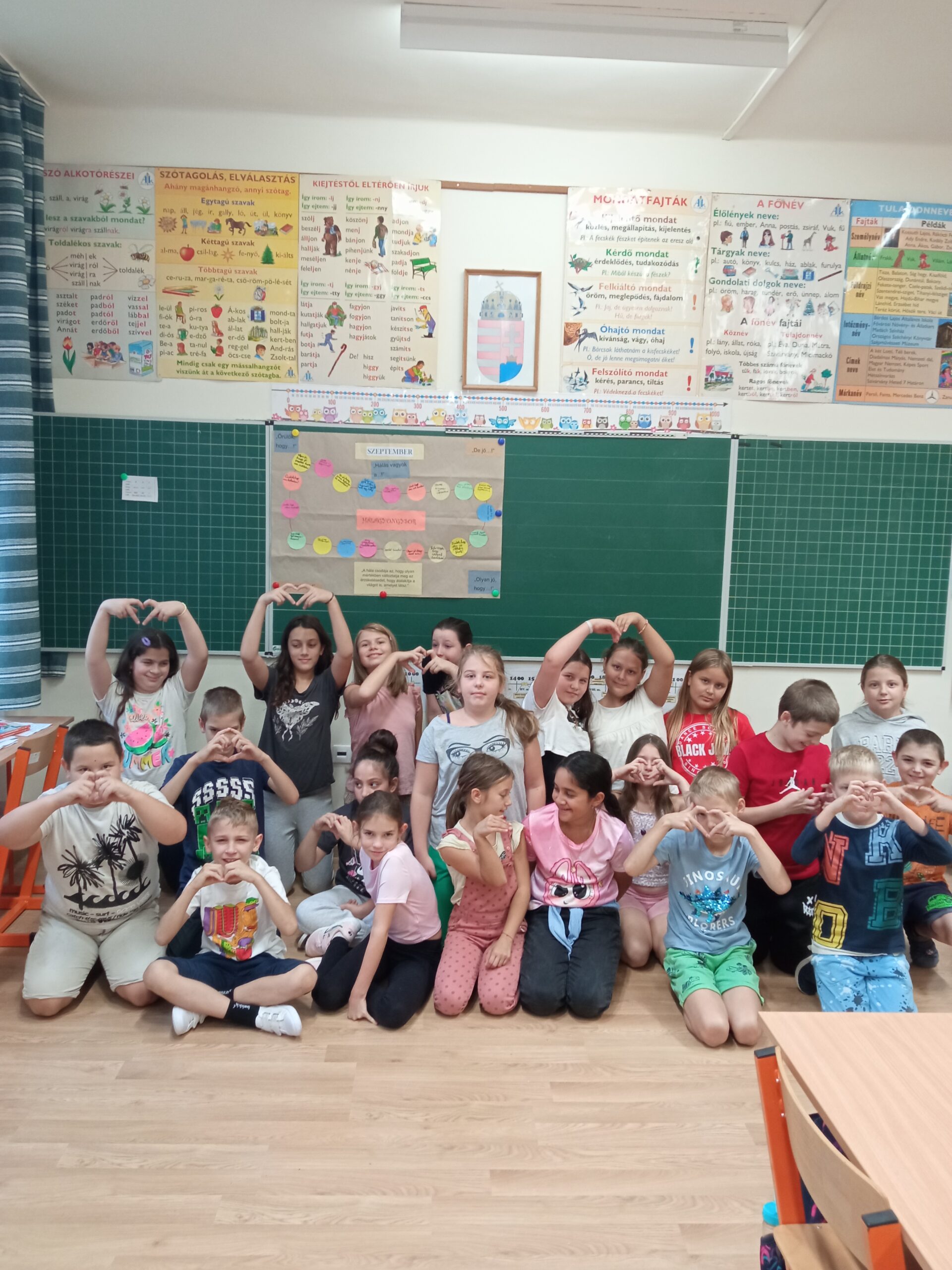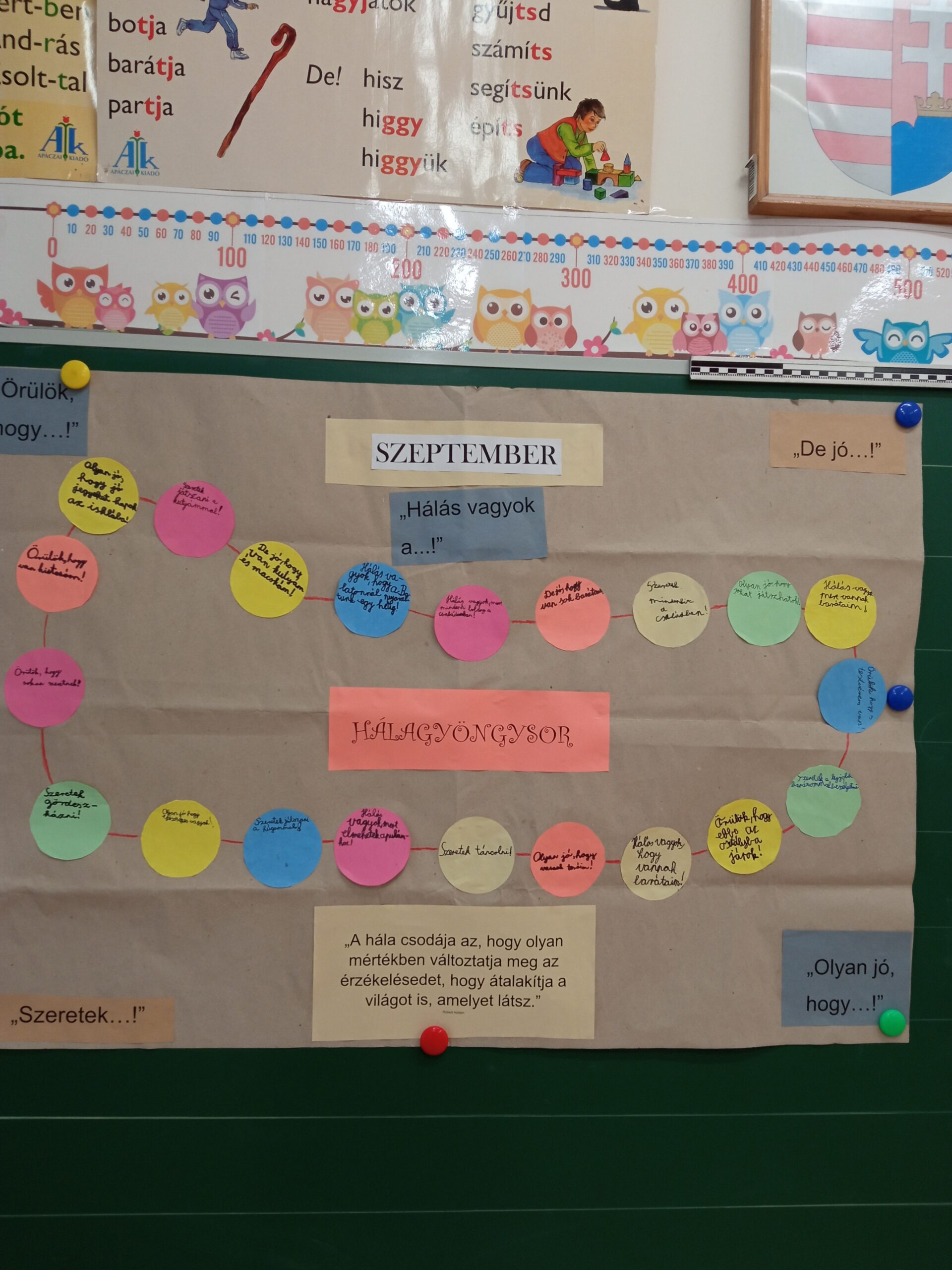 Bagdi Bella már általunk ismert dalával (Szép nap, ölelj…) ráhangolódtunk a szeptemberi témára. Néhány mozgásalapú relaxációs gyakorlat után a beszélgetőkörben megállapodtunk abban, hogy a hála kapcsolatban áll testünk és elménk egészségével. A hálás gondolkodás semlegesíti a rosszkedvet, a magányt, az ellenségességet, az aggodalmaskodást, sőt segít felismerni és értékelni a jót az életünkben, rengeteg előnyünk származik belőle. Egy papíron mindenki legalább 3 dolgot írt le, amiért most végtelenül hálás. Ebből a legkedvesebb került fel a gyöngyszemére, melyből az osztály egy közös gyöngysort „fűzött”. Az elkészült plakátunkkal hálatelt szívvel fotózkodtunk.