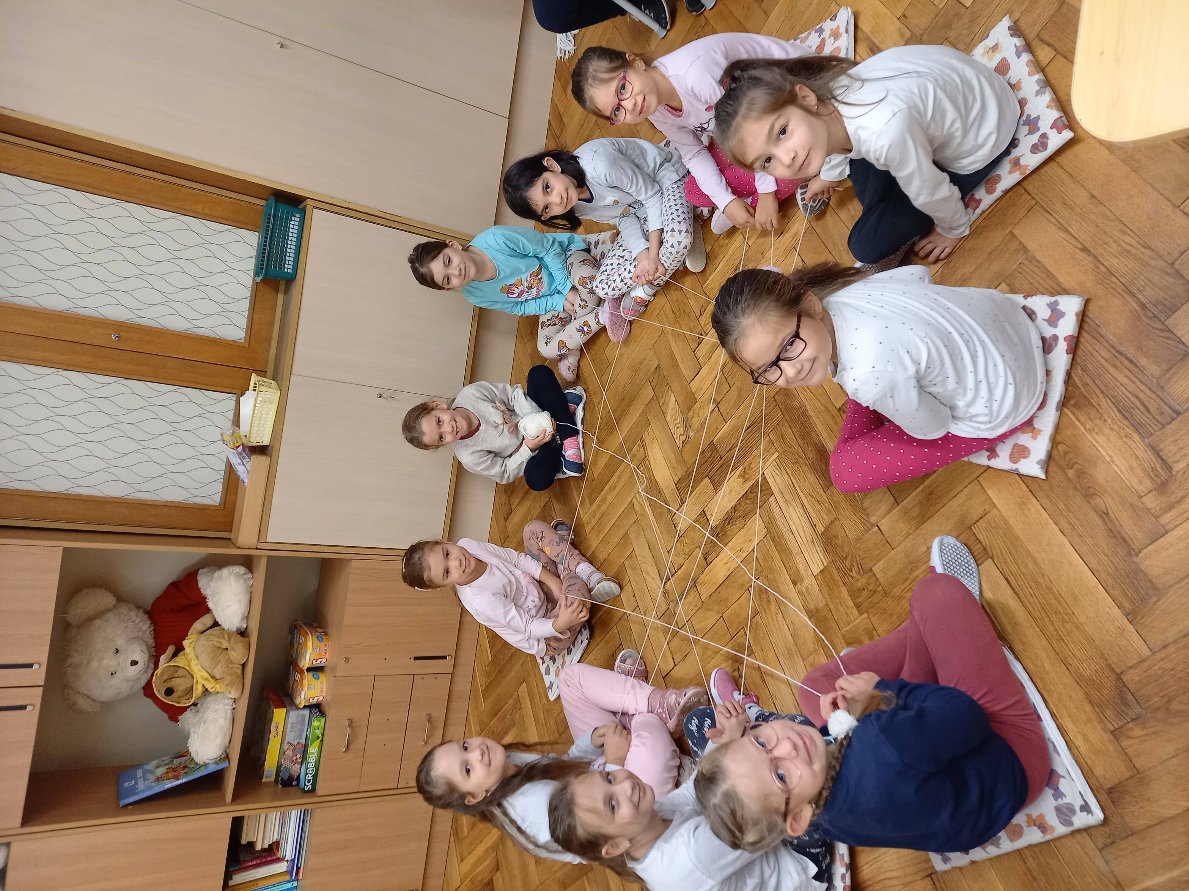 A választható feladatok közül a Hála-háló elkészítését vettük célba. Első osztályban nagyon fontos a kifejezőkészség fejlesztése, ezért a Hálás vagyok, mert……. mondat alkotására helyeztük a hangsúlyt. Fonalgombolyag gurítással készítettük el a saját Hála-hálónkat.