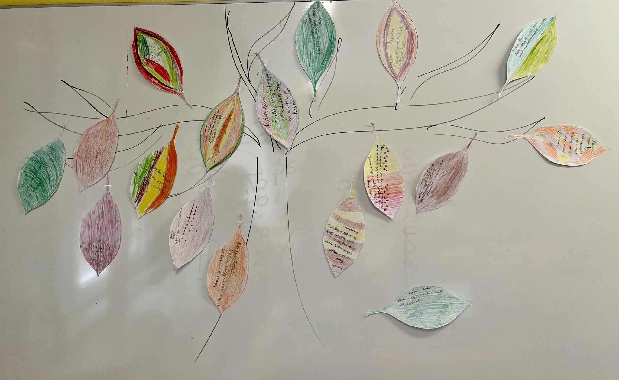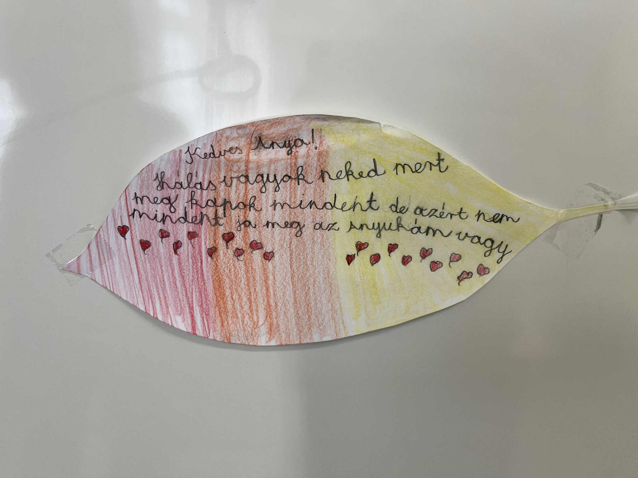 Az óra befejezéseként hálafát készítettünk. Minden tanuló kapott egy papír falevelet amire rá kellett írniuk egy kiválasztott személynek (családtag, barát), hogy kinek, miért hálásak. Nagyon sokat gondolkoztak a feladaton, de megérte, mert remekül sikerültek a falevelek.