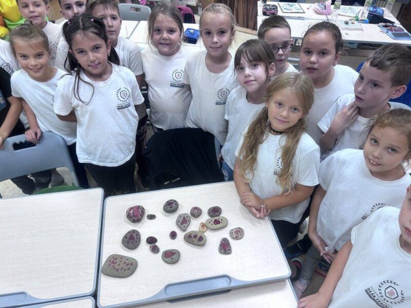 A havi boldogság foglalkozásunkat meditációval kezdtük. Felolvastam a mesét, majd irányított beszélgetés során megbeszéltük ki kinek lehetett hálás, és miért. Mindenki elmondta szerinte miért lehet hálás valaki, majd csoportban kellett különböző személyekről elmondani miért hálásak nekik. Mindenki keresett magának egy nagyobb követ, erre bármit lehetett volna rajzolni, hogy ki miért hálás. Nos nálunk mindenki szívet rajzolt, hogy a szeretetért hálás. Ez után mindenki a kedvenc jelenetét lerajzolta a meséből. Az óra végén meghallgattuk Bagdi Bella Élni jöttem albumáról néhány dalt, közben feltettük az új boldog várunk át az ajtóra (amihez idén nem lépcsők, hanem felhők fognak felvezetni).