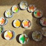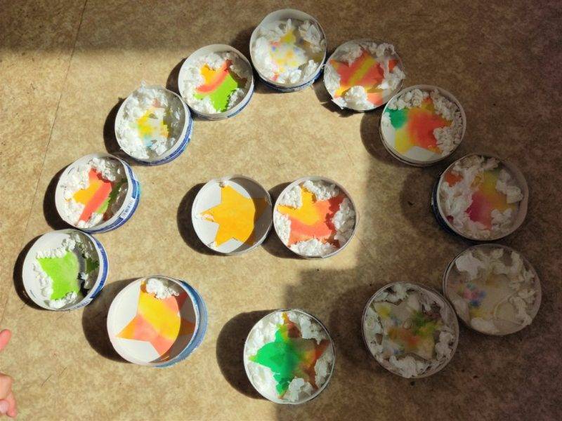 Sajtdobozba ragasztottak egy csillagot, amit előtte festékfolyatással készítettek, olyan színeket használva, aminek pozitív jelentése van, leginkább a piros és sárga árnyalatai uralkodtak. Fehér krepp papírral pedig a csillag szélét emelték ki, tépéssel, kis gurigákat ragasztottak hozzá.