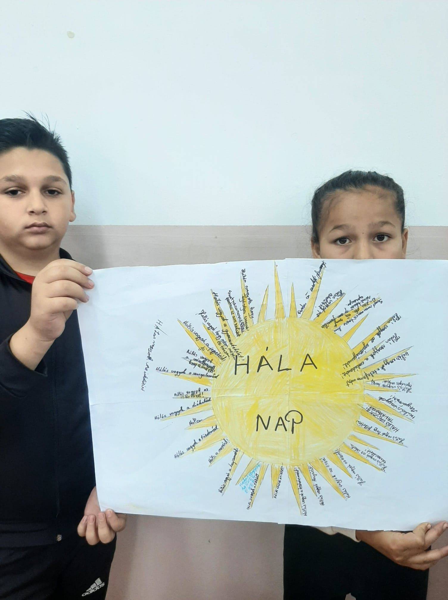 A hála téma nagyon megérintette a gyerekeket, nagyon sok ötletes rajz készült. Hála napot készitettünk a sugaraira ráirták a tanulók miért hálásak s megérték iskolánkban tanitó minden pedagógust irjanak egy egy sugárra. Nagyon jó volt igy mindenki bekapcsolódott és rájöttünk milyen apró dolgokkal kezdődnek a nagy kihivások.