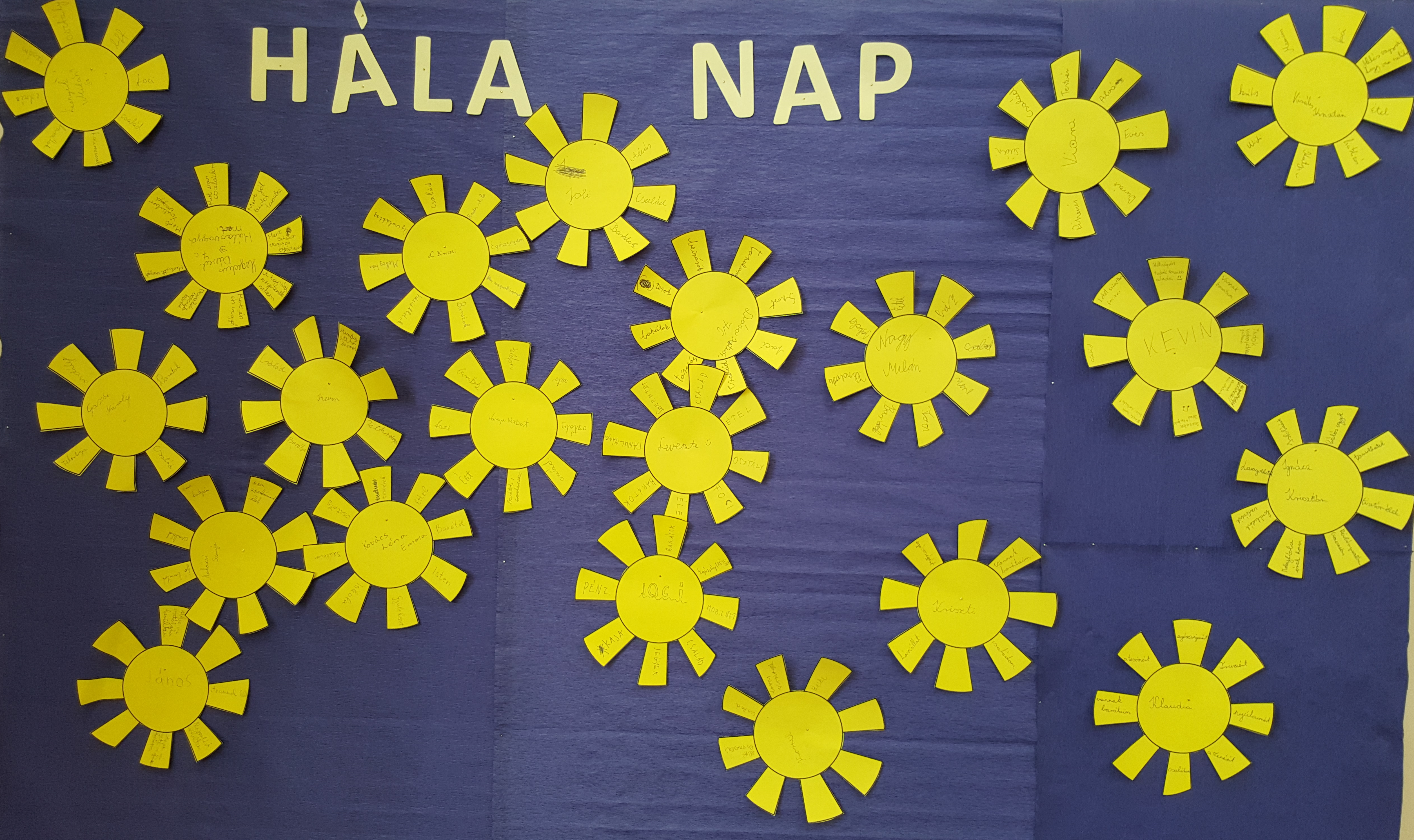 A gyerekeknek egy nap sugaraira kellett felírniuk, hogy miért hálásak, ezután feltűzték a napokat a faliújságra. Hetedikesekként nagyon szégyenlősek lettek és nem akartak a fényképező gép elé állni, ezért róluk nem készült kép, ahogy feltűzik a napot az égre.
