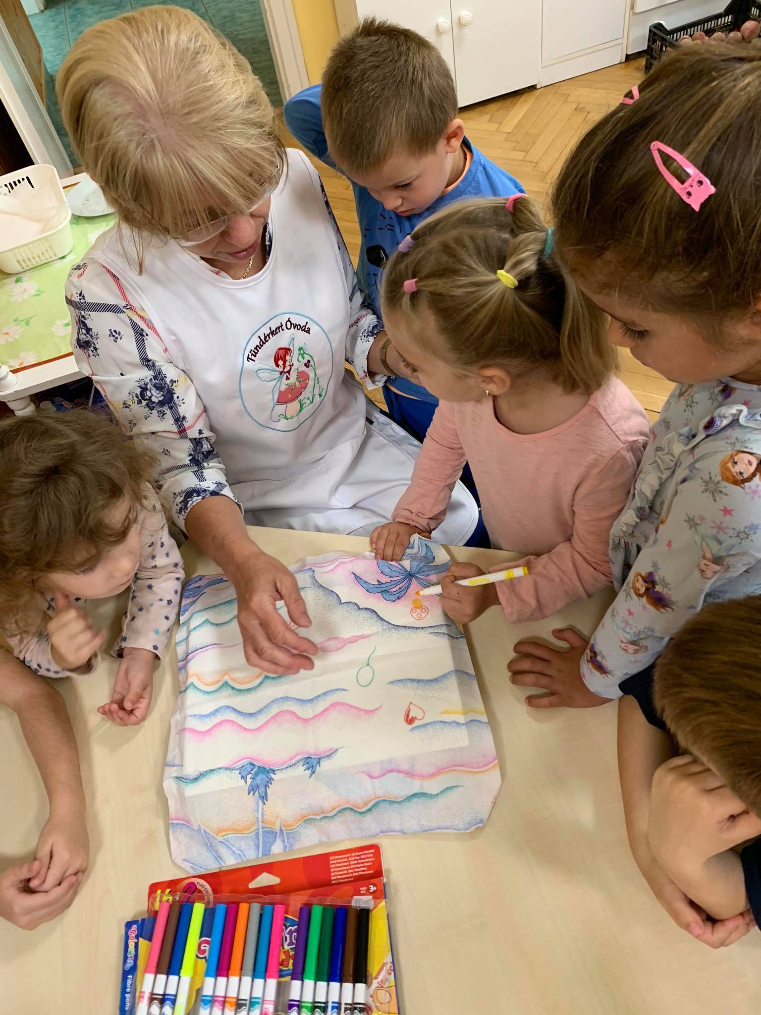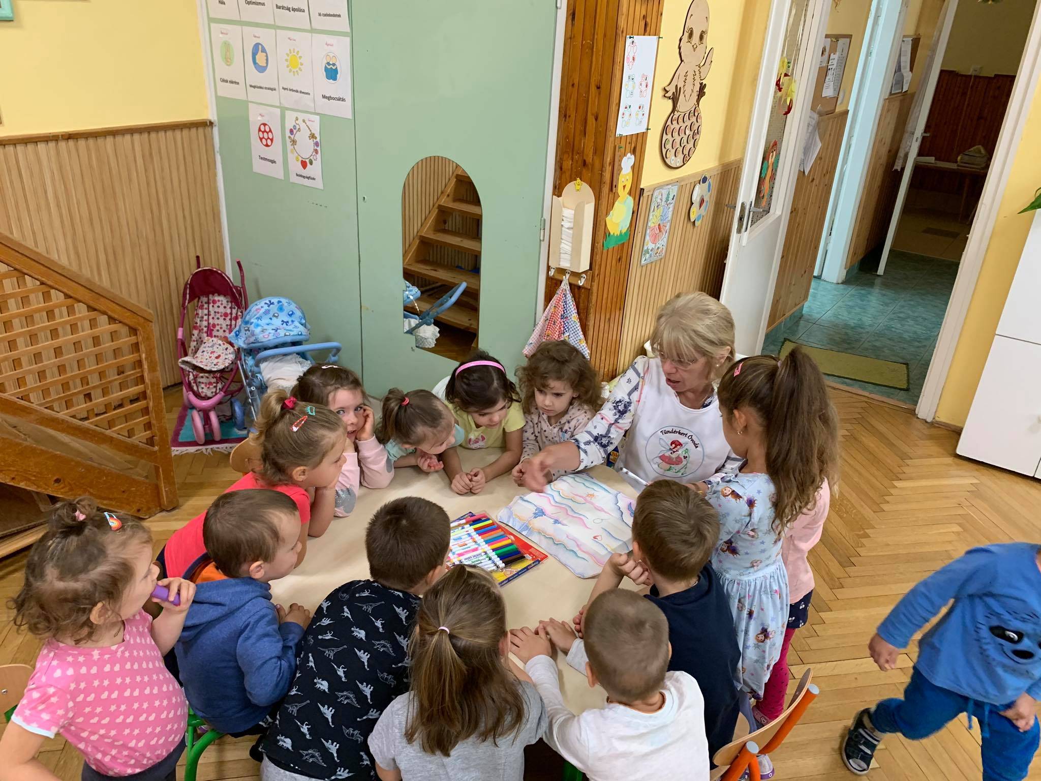 Elkezdődött az új tanév, a saját csoportunkba kerültünk vissza a nyári élet után. A hála fogalma már ismerős volt a tavalyi év után a gyerekeknek. Felelevenítettük az eddigi ismereteket. A mesehallgatás után / A Hálafa története /, a gyerekeknek is lehetőségük volt elmondani, hogy kinek hálás és miért. Minden héten tovább bővítettük az ezzel kapcsolatos ismereteket, míg elérkeztünk a hála párna készítéshez. Felkerült rá mindenki jele. A jelek színezését a gyerekek végezték el. Minden kisgyermek elmondta, hogy hová szeretné a jelét tenni a párnán. Amikor elkészült, körbe adtuk egymásnak, amikor a kezébe került elmondta, hogy miért hálás a mellette lévő kis társának, akinek tovább fogja adni. Megbeszéltük, hogy mindennap az a kisgyerek kapja meg egész napra, akinek valamiért azon a napon hálásak vagyunk. Ezt a falon egy táblán jelöljük is. Elhangzott az egyik legszebb mondat is, „hálás vagyok azért, mert újra együtt vagyunk”. A hála párnánknak varázsereje is van, mert nagyon sok szeretet ad a csoportunkba járó gyerekeknek. A szülői visszajelzések is ezt igazolják, mert többen visszajeleztek, hogyan élik ezt meg otthon a családok. A hónap dala a mindennapjainkban, szabad játék közben is szólt.